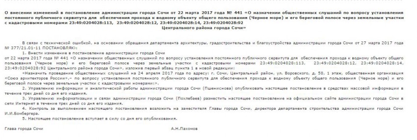 Постановление администрации города Сочи от 22.03.2017 № 441 «О назначении общественных слушаний по вопросу установления постоянного публичного сервитута для обеспечения прохода к водному объекту общего пользования (Черное море) и его береговой полосе через земельные участки с кадастровыми номерами 23:49:0204028:113, 23:49:0204028:12,23:49:0204028:14, 23:49:0204028:92 Центрального района города Сочи.