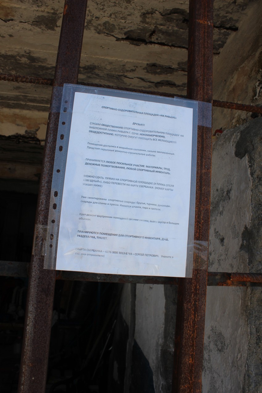 В самом начале эпопеи с пляжем Ривьера первой под раздачу попала доступная спортивная площадка, долгие годы находившаяся на этом месте и обустроенная жителями города на собственные средства. Площадка сама по себе уникальна: набор тренажёров как в нормальном спортивном зале, при этом пользование ими абсолютно бесплатно. Вообще, пляж «Ривьера», в первую очередь, это средоточие людей ведущих здоровый образ жизни: это и волейболисты, и атлеты… В общем, волейбольные и спортивную площадки перенесли.