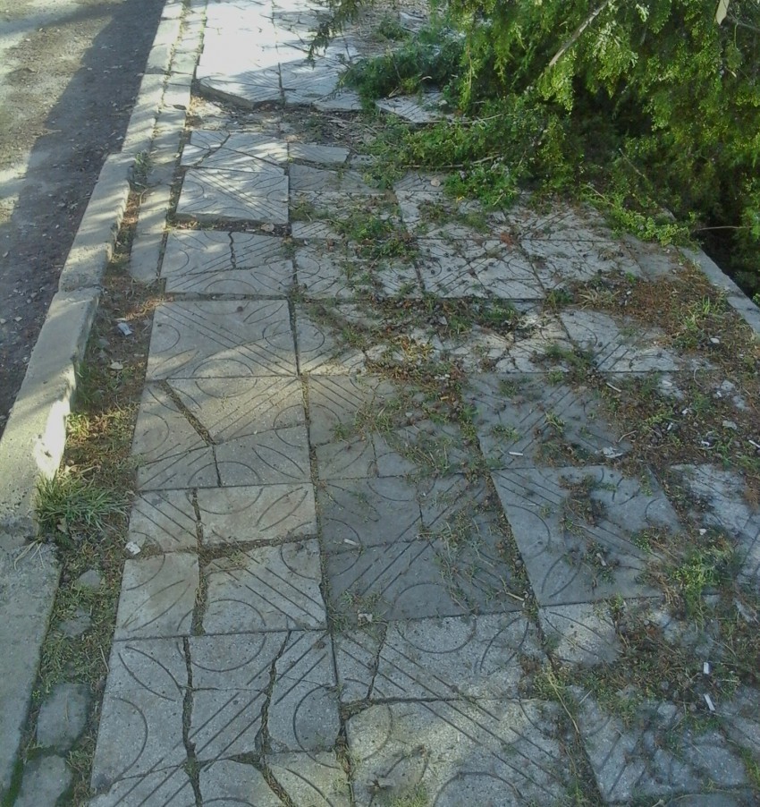 1. Участок тротуара, находящийся между магазином «Пятёрочка» (ул. Бытха 30) и многоквартирным жилым домом по ул. Бытха 30/1, длительно нуждается в замене поломанной и потрескавшейся тротуарной плитки, а также — уборке сломанных ветвей на обочине (микрорайон Бытха):