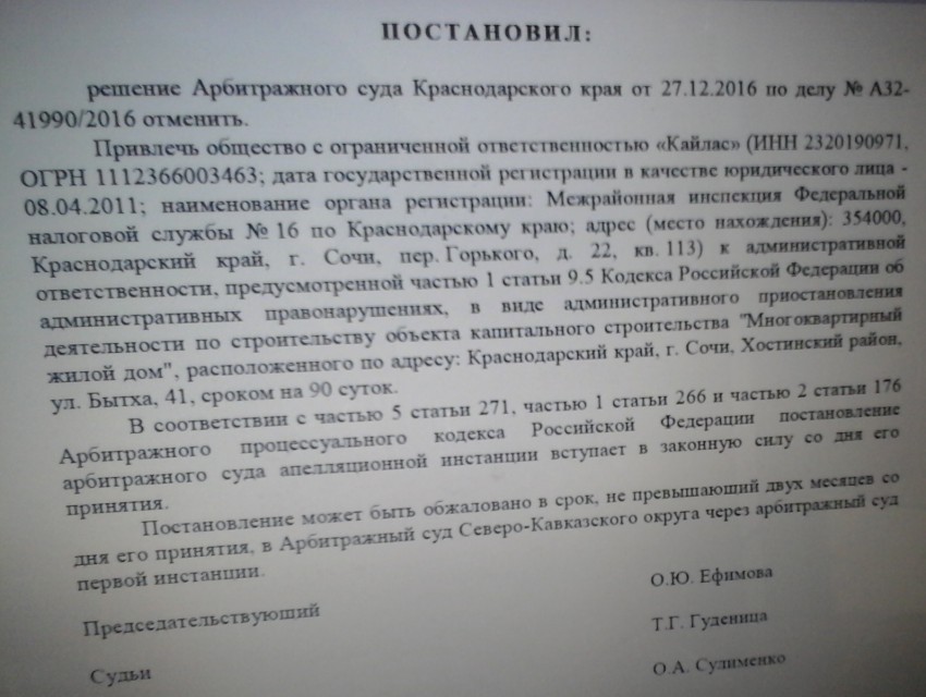 Согласно нему, предыдущее решение Арбитражного суда Краснодарского края от 27.12.2016 было отменено, ООО «Кайлас» привлечено к административной ответственности в виде приостановления деятельности по строительству объекта капитального строительства “Многоквартирный жилой дом”, расположенного по адресу Краснодарский край, город Сочи, Хостинский район, ул. Бытха 41, сроком на 90 суток.