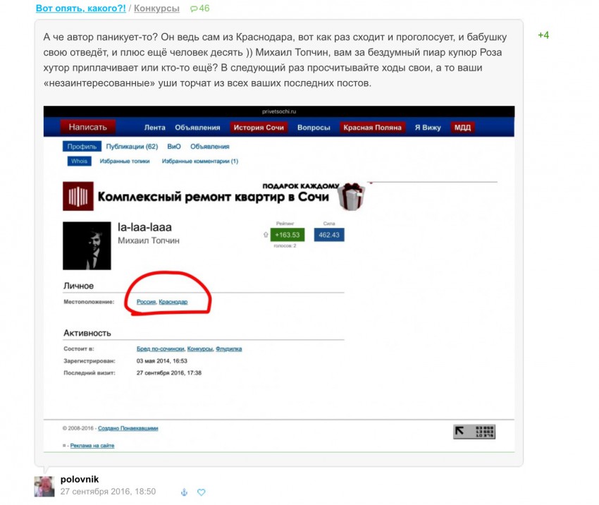 Я когда смотрела его профиль, была уверена, что человек двести процентов работает в администрации… но в профиле — то ли Краснодар, то ли Питер…