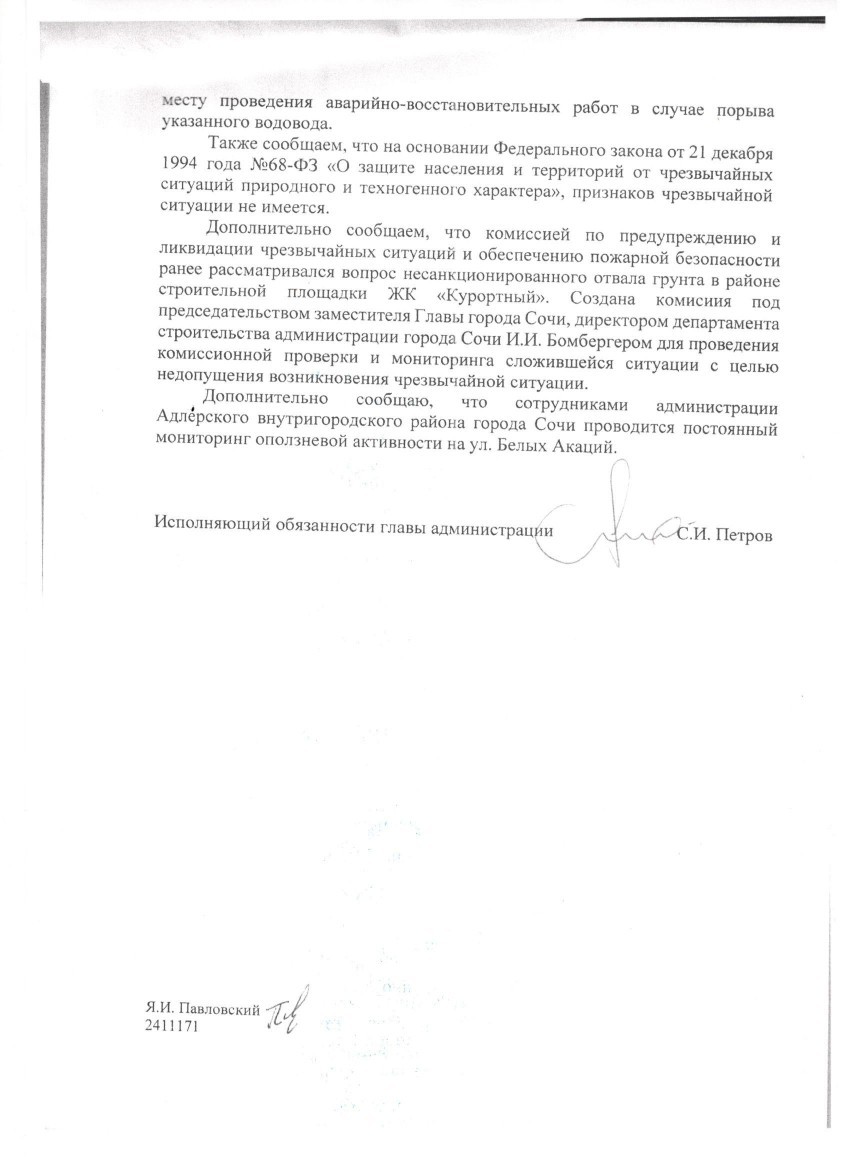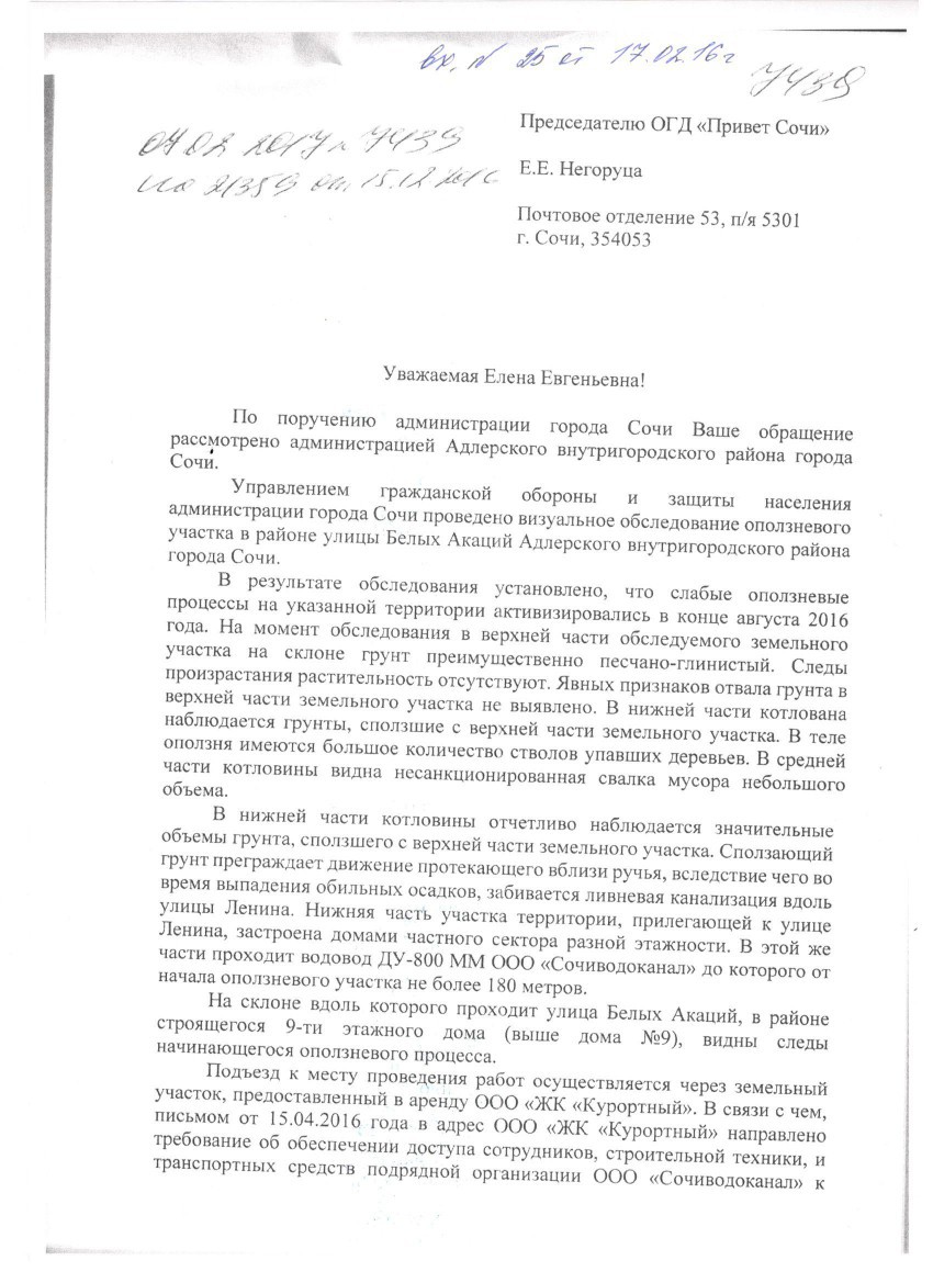 Уважаемый Анатолий Николаевич, Общественное Гражданское Движение «ПриветСочи» 13.12.2016г письмом исх. № 38 обратилось к Вам по вопросу образовавшегося, в результате бесконтрольных земляных отвалов грунта, оползня на улице Белых Акаций. По ответу, полученному из администрации Адлерского района г. Сочи, нам стало понятно, что данная тема не является предметом беспокойства городских структур отвечающих за безопасность горожан.