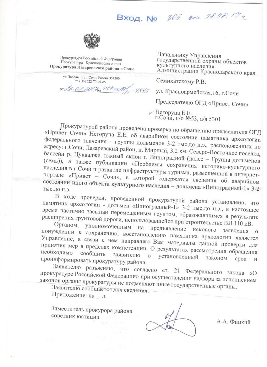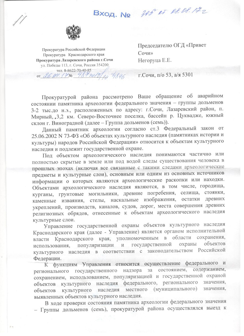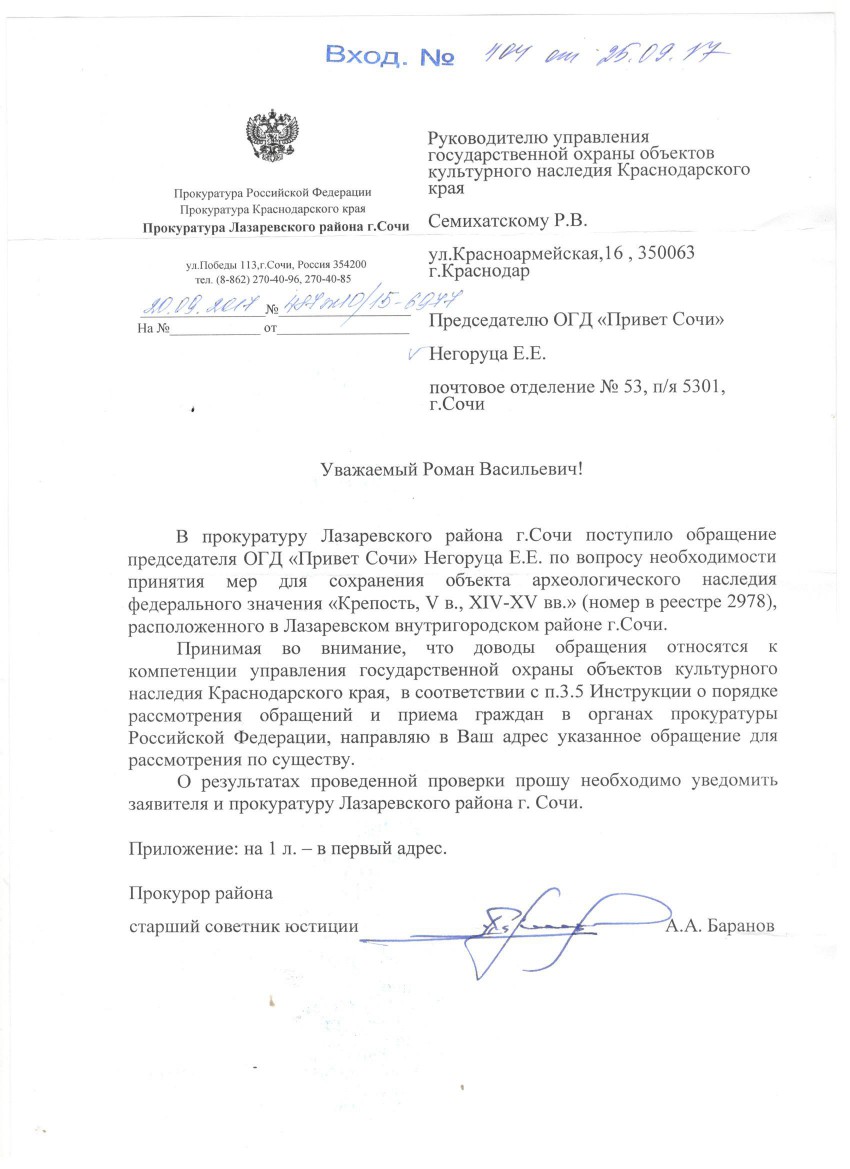 На территории города Сочи находится объект археологического наследия (памятник археологии) федерального значения «Крепость, V в., XIV-XV вв.» (гос. № 2978, г. Сочи, Лазаревский район, пос. Волконка, юго-восточная окраина поселка, санаторий «Чемитоквадже», устье р. Годлик). Данный объект находится в неудовлетворительном состоянии и требует специальных мер для сохранности.