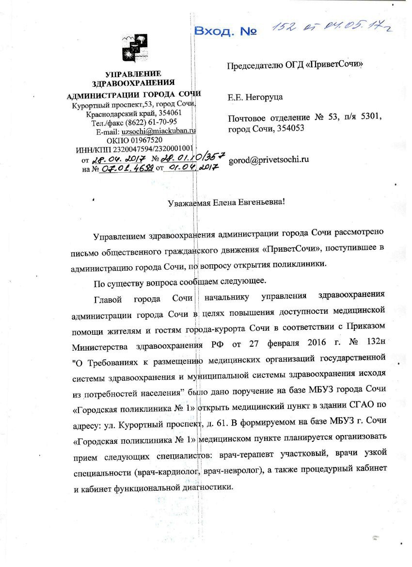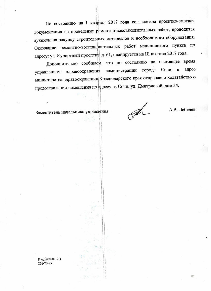 Про отписку «Дополнительно сообщаем, что в настоящие время управлением здравоохранения администрации города Сочи в адрес Министерства здравоохранения Краснодарского края отправлено ходатайство о предоставление помещения по адресу гор. Сочи ул. Дмитриевой дом №34» господин Лебедев совсем забыл. Первое письмо по вопросу размещения поликлиники в пустующем три года помещении бывшей станции переливания крови мною было подано в администрацию города ещё двадцать третьего января 2017 года.