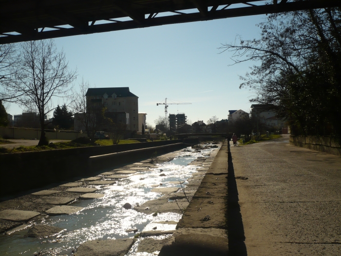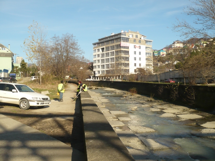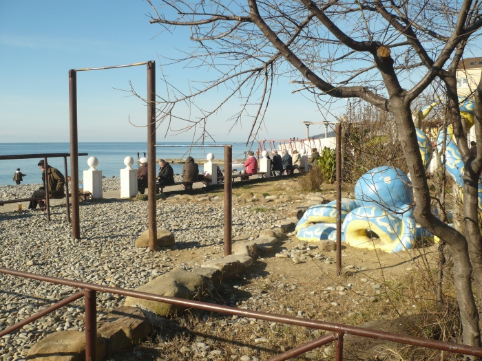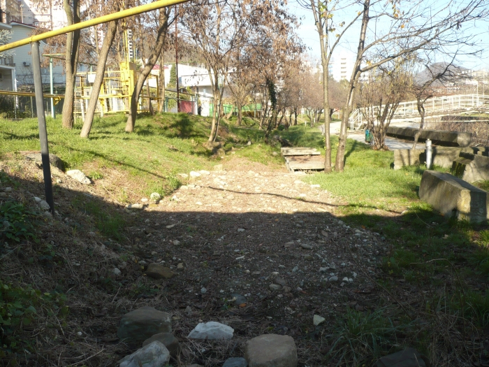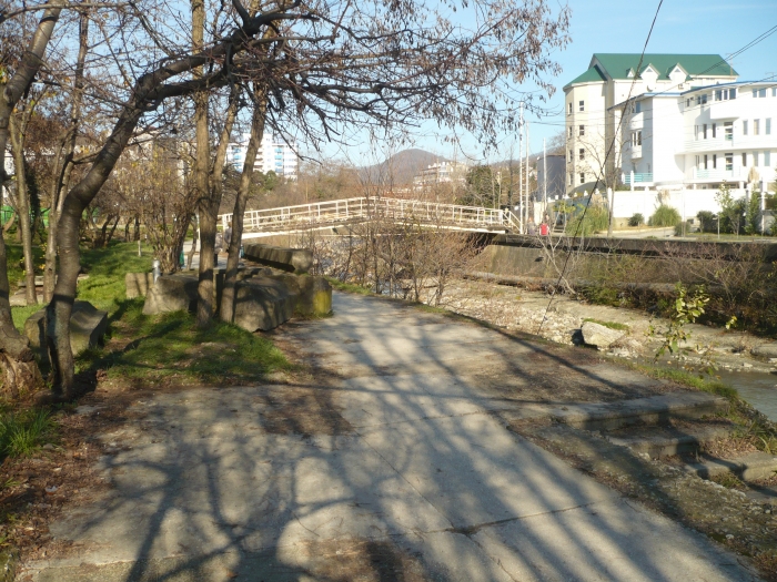 Первое, что бросается в глаза, когда идешь по набережной реки Псахе к морю, это полное отсутствие лавочек, заброшенность и не ухоженность