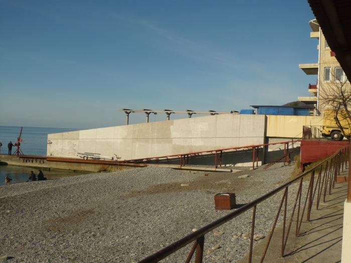 Пляж отделен от остального мира капитальной кирпичной стеной высотой метра три