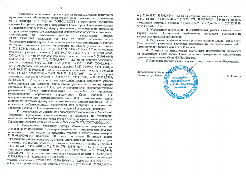 Но посмотрим основание отклонения от разрешенных параметров (постановление прикрепляю): конфигурация участка неблагоприятна для застройки и длина сторон участка по уличному фронту не соответствует градостроительным регламентам Правил землепользования (в зоне Ж4 минимальная длина должна быть 40 м, ширина — 20 м, а участок имеет длину 15 м и ширину 9,5 м).