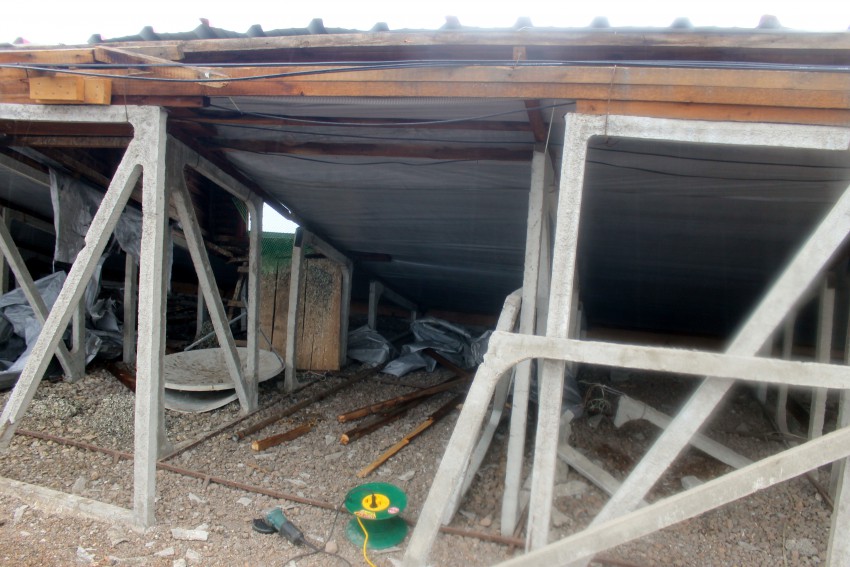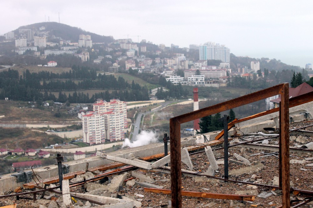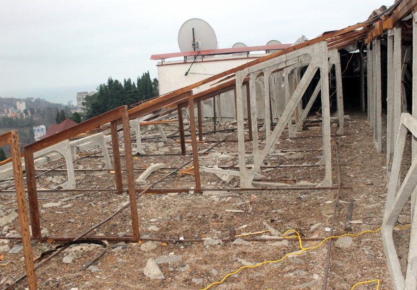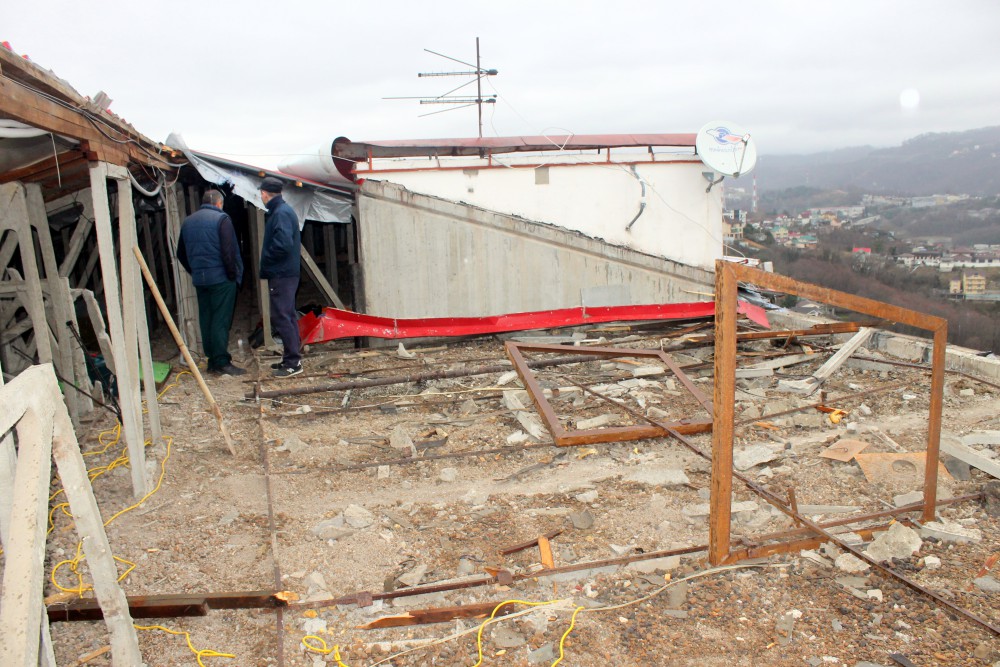 Ещё до Нового года жители писали заявки в домоуправление «Светлана» на ремонт крыши многоэтажного дома №56 по ул. Дмитриевой. Дом на вершине Лысой горы построен в 1977 году, бетонные блоки фермы плохо закреплены, от времени и ветра начинали сыпаться. Перед Олимпиадой 2014 года, при ремонте фасада, оцинкованное листовое железо на крыше заменили на красно-бурый металлический профиль, под один цвет с крышами всех домов города. После вчерашнего ураганного ветра в 19 м/с над четвертым подъездом участок металлического профиля крыши сорвало со стороны гор. Перелетев через дом профиль упал рядом со станцией переливания крови, улица Дмитриевой дом №34, как это видно на фото. В интернете ошибочно написали, что крышу сорвало со станции переливания крови.