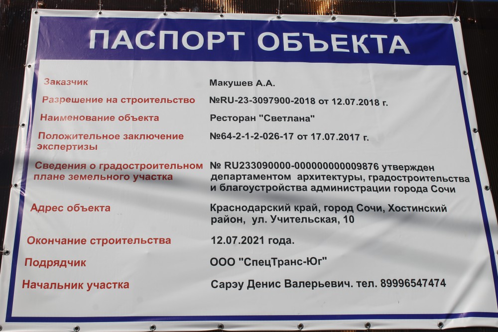 В микрорайоне «Светлана» Хостинского района города Сочи для строительства ресторана «Светлана» в апартаментном комплексе «Тургенев» по ул. Учительской дом 10 на участке с кадастровым номером 23:49:0302008:74 администрацией города было выдано разрешение на строительство №RU-23-309-7900-2018 Макушеву А.А. На строительство АК«Тургенев» разрешения не было. Ресторан «Светлана» снесли. Об этом писал: Ресторан «Светлана», На месте ресторана «Светлана».