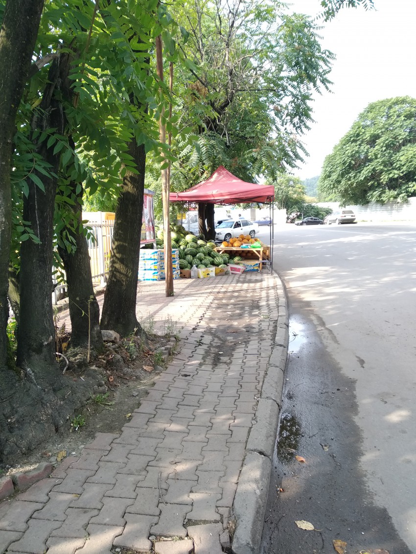 В целом это привычное для гостей из Средней Азии место торговли овощами и бахчевыми. В прошлые годы они так не наглели и просто организовывали выносную точку продаж. А в этом году, похоже «порешали вопросы» и в наглую заняли всю площадь тротуара. Номера с ГАЗели предусмотрительно скручены. А на противоположной стороне дороги их же огромный ларек на остановке (на территории «оттяпаной» забором под «реконструкцию ливневки»). Но об этом мой следующий пост.