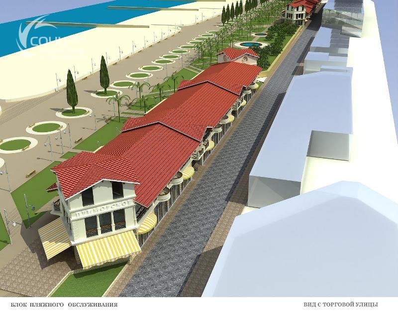 На представленных проектах виден проезд между гостиницами и ларьками, ряд зданий (возможно, гостиниц или жилых домов под видом апартаментов), что-то типа двух-трех--этажной торговой галереи, два паркинга (это чтобы не забывали на пляже дышать не морем, а угарными газами) — на Ривьере и возле морвокзала,
