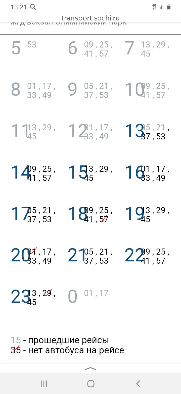 Смотрите, сегодняшний скрин расписания — перечёркнутое время красной чертой означет «НЕТ АВТОБУСА НА РЕЙСЕ».