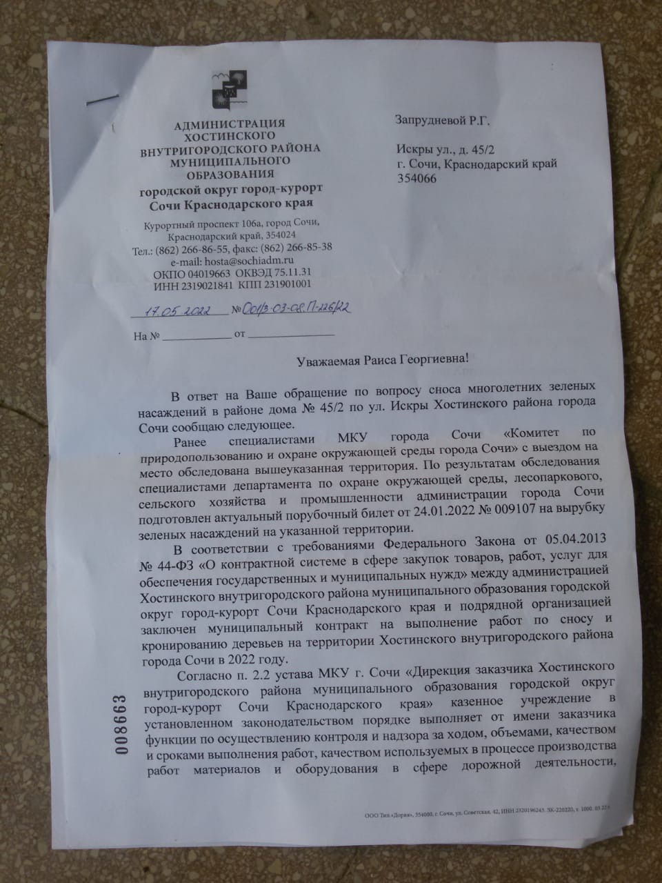 То есть помимо того что деревья сами по себе представляют угрозу, они ещё и находятся на оползневой горе. То есть это в двойне опасная ситуация и все равно никаких мер не предпринимается. Вот так хостинская администрация на ровном месте создаёт угрозу для моей жизни и жизни моих близких. И на все мои обращения избавить меня от угрозы быть раздавленной аварийными деревьями мне отвечают денег нет но вы держитесь.