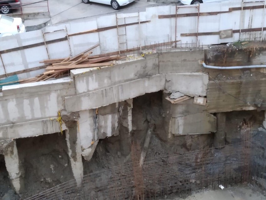 Вообще там часть из под ростверка высыпалась. Нужно это все восстанавливать. Но сделать это можно будет после того как они свой нулевой цикл сделают, подпорную стену или что там у них будет. Трещины это ерунда. Вот если асфальт провалится — вот это да будет!