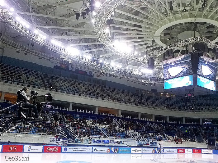 На самый верх приходиться подниматься по череде длинных лестниц, лифты есть, но их безнадёжно мало и в них очереди. Наверху в верхних секторах тепло, но далеко и ничего не видно. Смотреть можно только на большие экраны в центре зала, но они сильно искажают цвета. Ещё хочется отметить просто запредельно ужасный, бубнящий звук, в котором не удавалось разобрать решительно ничего, даже объявления на перерыв.