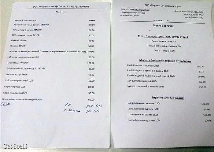 Ознакомление с ценами и меню — одно из самых ярких впечатлений от поездки. Сосиска в тесте — 250 руб. Бутерброд — 150 руб. Спасибо не надо. Народ возмущается и отстояв очередь отказывается брать. Продавщицы орут и хамят. Всё как всегда. Не спасают даже улыбающиеся волонтеры.