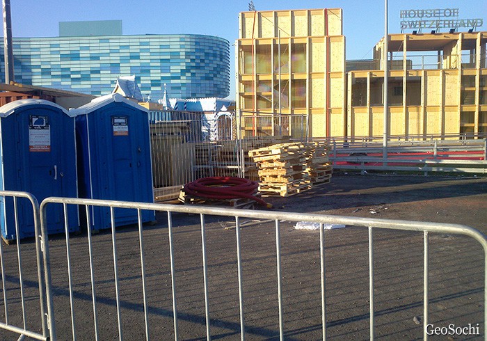 Огромная лужа встречает нас на входе в олимпийский парк, в ней отражается замотанная в полиэтилен олимпийская символика. Значит мы прибыли по адресу. Вэлкам!