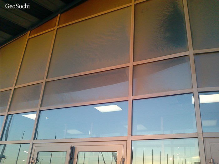 Оказывается этот странный цвет придаёт ничто иное, как массивный слой грязи на окнах. Экология на стройке мягко говоря не ахти.