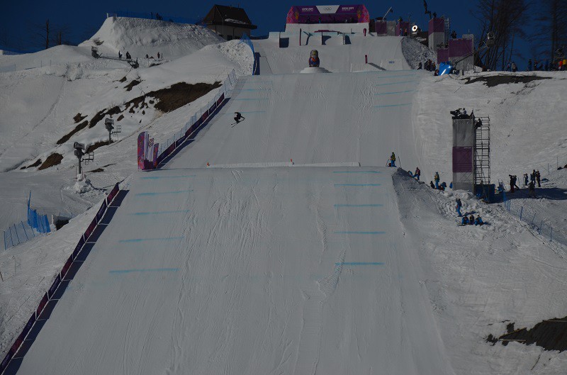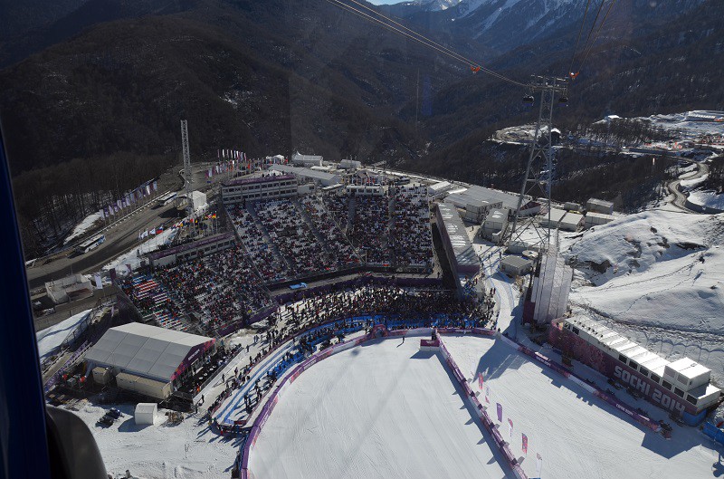 Но на Роза Хутор с подъемником нас разочаровали. Допускаются лишь зрители с билетами на соревнования. Но волонтер, поняв что мы просто гуляем, предложил иной маршрут — в Экстрим Парк.