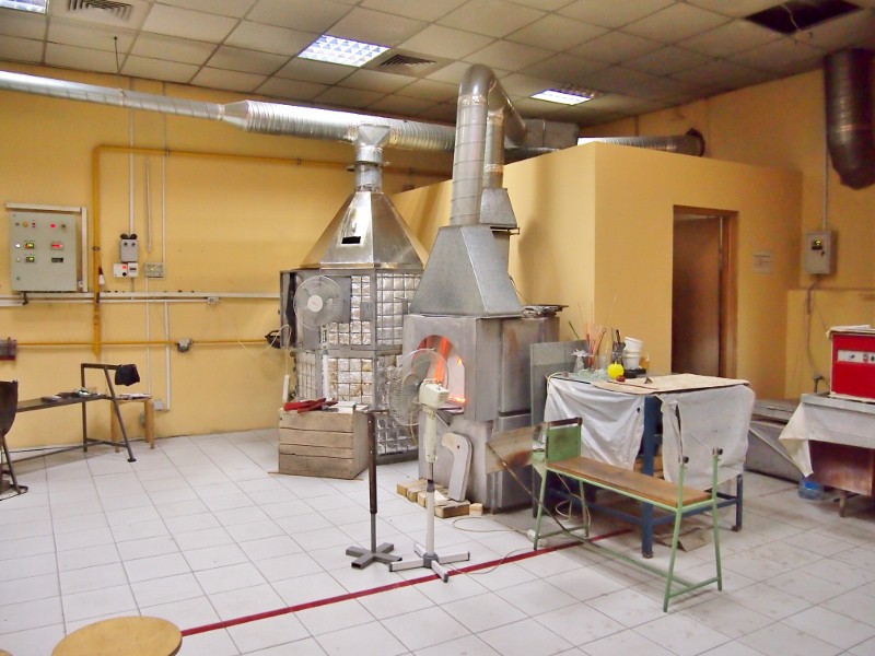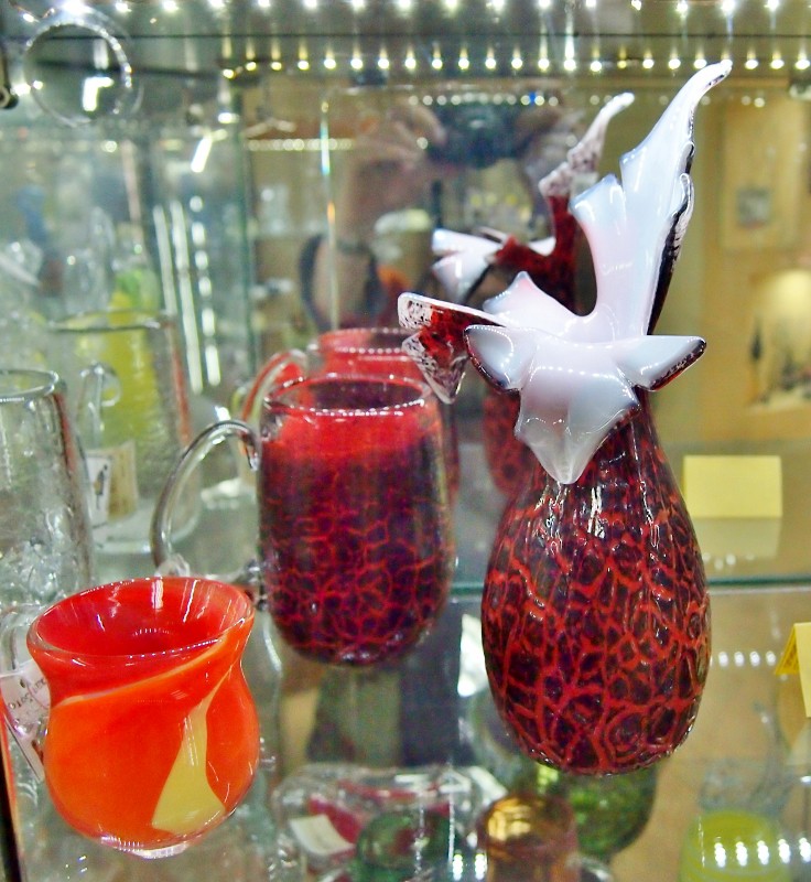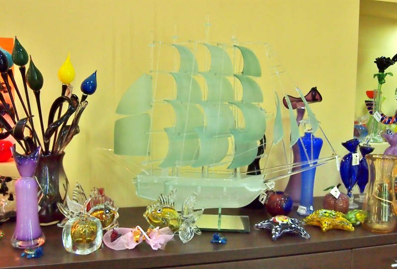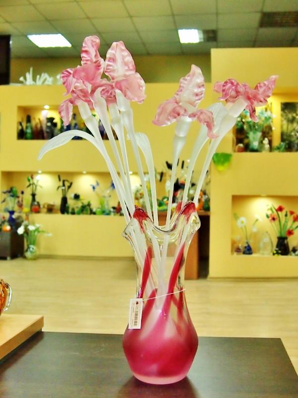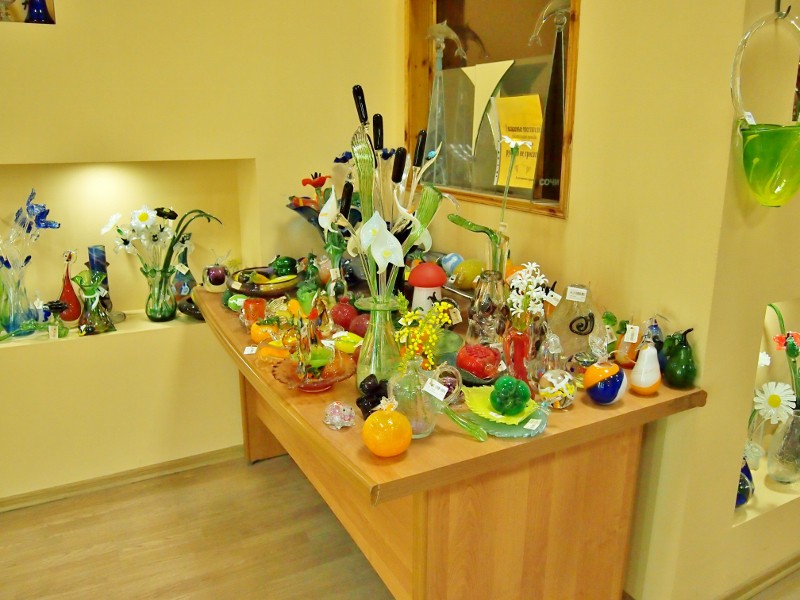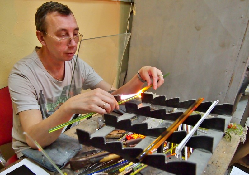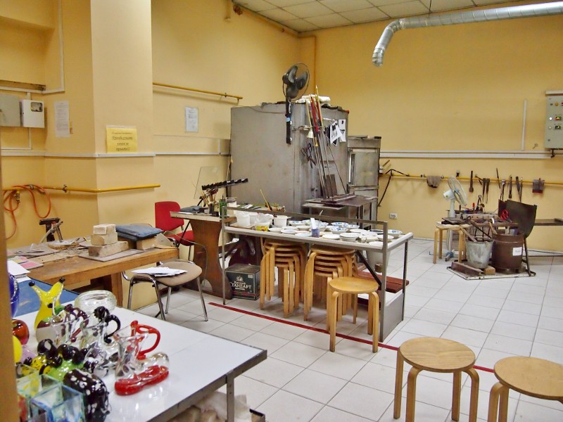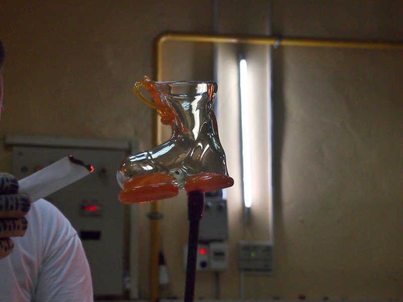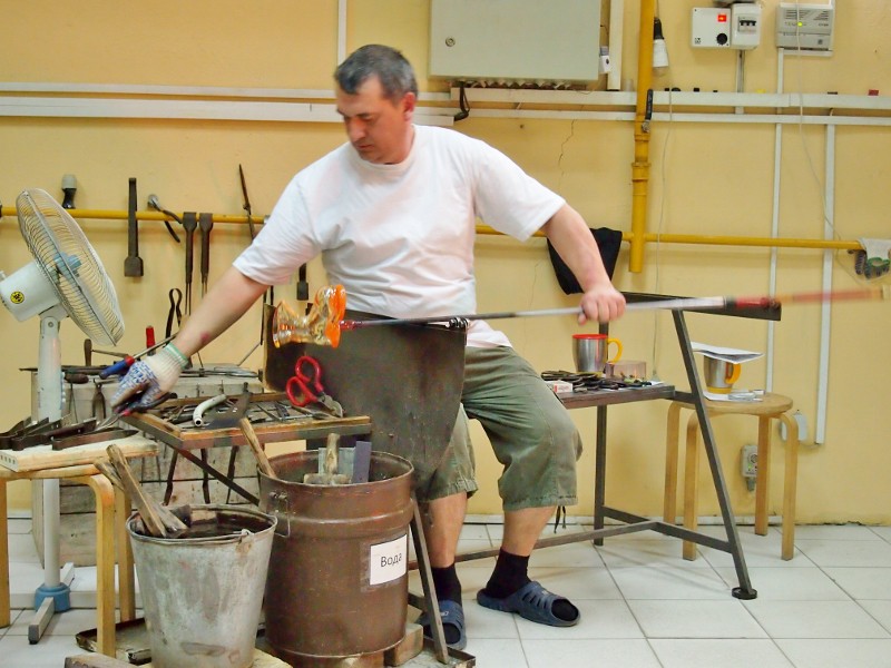 Ботинок откусывают «секатором» от трубки и помещают на сутки в камеру с температурой 400 градусов (достигается принятием внутрь 10 бутылок водки! :)). Иначе он при остывании разлетится вдребезги. Нам это продемонстрировали на примере простого изделия — лебедя, который неожиданно взорвался в ящике для отходов. Для тонких работ используют горелку и специальные разноцветные стеклянные бруски — дроты. Здесь делаются мельчайшие детали для сложных композиций.