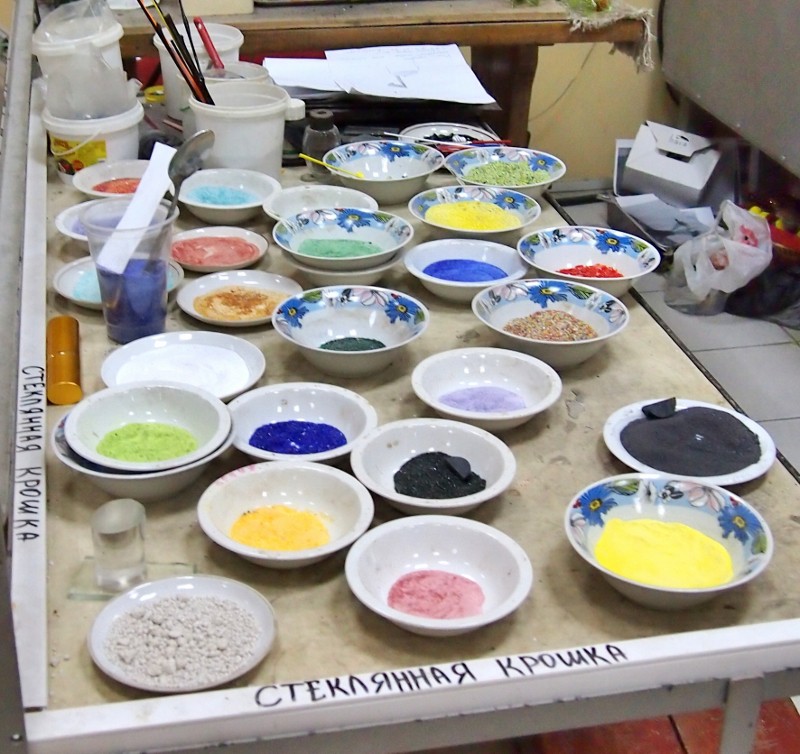 До Форелевого хозяйства мы уже доехали в прошлый раз. Сворачиваем направо и мимо таверны «Каньон» подъезжаем к бывшему клубу. Там несколько лет творятся интересные вещи: художественные изделия из стекла. Стекло варят на месте в круглосуточно работающей печи из т.н. шихты: смеси кварцевого песка, поташа и чего-то ещё. На фото она показана в левом нижнем углу, и рядом цилиндрический брусок готового стекла, которое из нее получается. Цветное стекло варится с добавлением окисей разных металлов: кобальта, меди, хрома, селена, а рубиновые звезды (всегда думал, что они из рубина в чистом виде) на башнях Кремля с добавлением золота (на столе не заметил!)