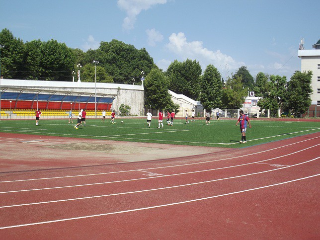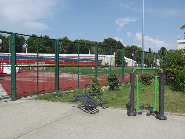 Кстати, рядом с полем стоят спортивные тренажеры, и как я понял со слов работников школы, туда не возбраняется ходить всем желающим.