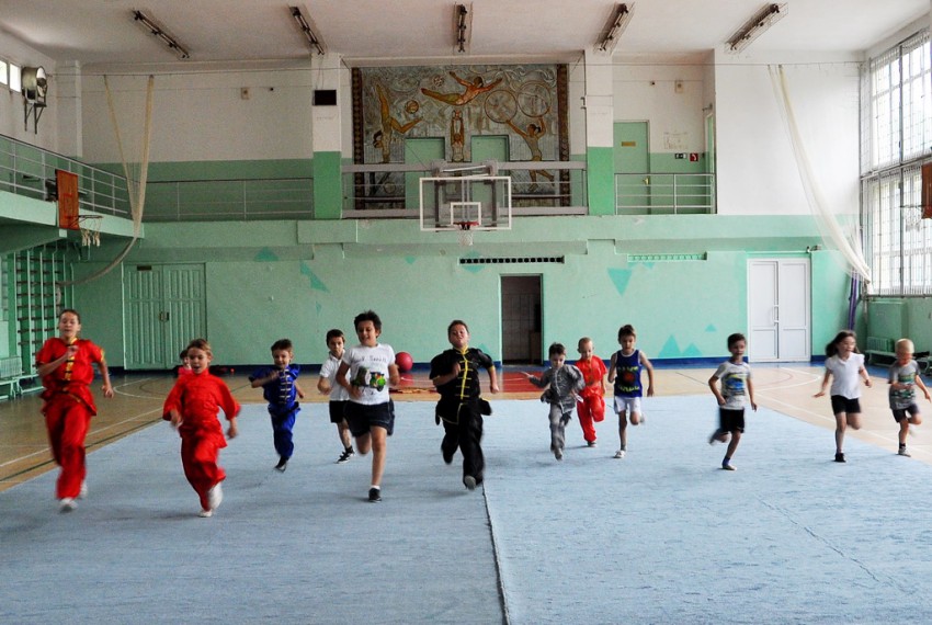 Тренировки ушу проходят интенсивно, сначала общая физическая подготовка, бег на выносливость, потом растяжка на гибкость, упражнения с оружием и без него. За каждым движением учеников наблюдает опытный тренер.