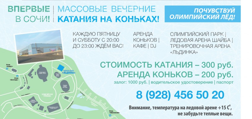 Спешу сообщить, что теперь в Сочи появилась уникальная возможность попробовать встать на коньки. Каждую пятницу и субботу на площадке тренировочной арены для хоккея организовано катание (300 руб) и прокат коньков (200 руб.). Катание проводиться с 20-00 до 22-00. В прокате имеются коньки разных размеров, работает кафе и играет музыка.