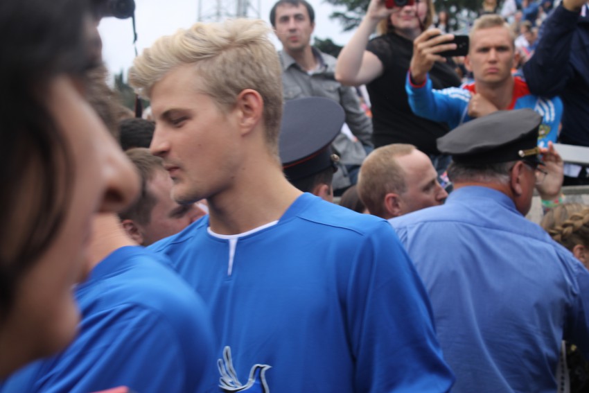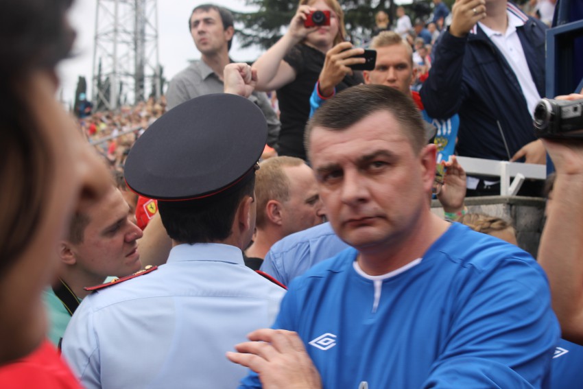 У выхода спортсменов на поле толпились любители автографов и фотографий в ожидании звёзд эстрады.Мало кто обратил внимание на тренировавшихся на поле футболистов в красной форме.Наступило время начало матча, но на поле ни кто не выходил. Толпа фанатов терпеливо ждала.Вот вышли пилоты Гран-При, а звёзд эстрады так и не было, казаки и телеоператоры разошлись по местам!!! Толпа недоумевала… Ведущий представляя составы команд назвал трёх звёзд эстрады в команде *Русич-Старко*.Инкогнито звёзд эстрады открылось взору, когда на фоне команды с вступительными речами выступили: председатель Олимпийского камитета России Александр Жуков, певец Александр Шевченко и фигурист Илья Авербух.В составе сборной пилотов вышли такие известные гонщики как Данил Квят, мексиканец Серхио Перес, швед Маркус Эриксон, датчанин Кевин Магнусен.