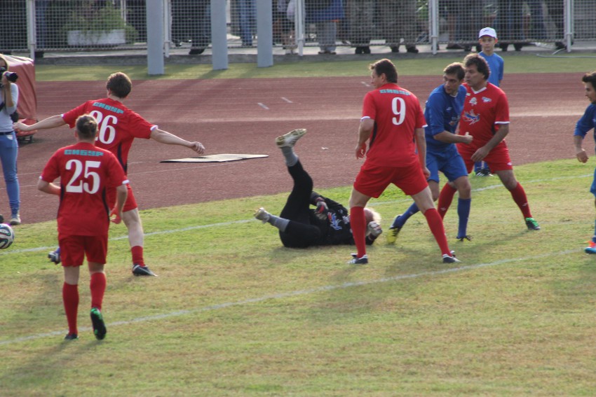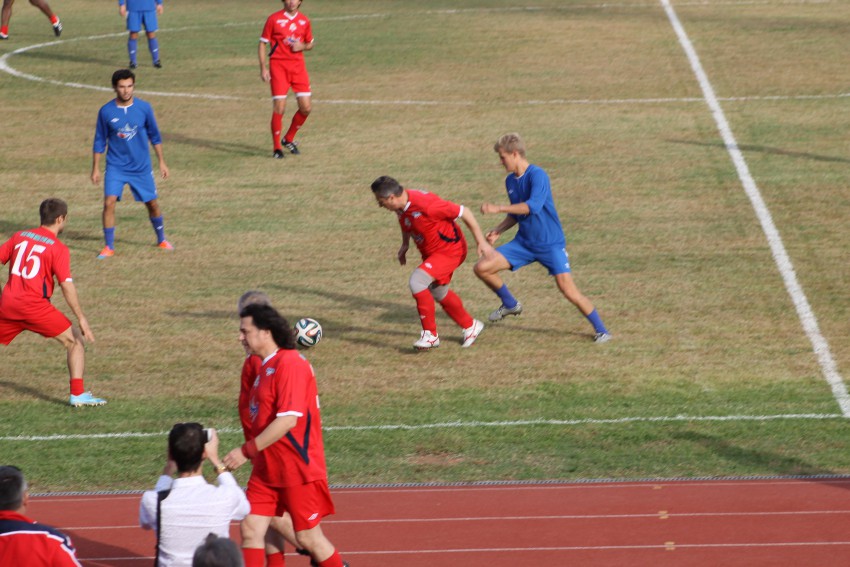 Начался матч.Игроки обеих команд изо всех сил старались показать зрителям настоящую игру.Благодаря забитым мячам игра получилась похожей на любительский футбол.Первый период, со счетом 5:3, выиграла команда звёзд эстрады-*Русич-Старко*.Благотворительный фонд *Под флагом добра* организовывает такие матчи во всех городах России.На лечение детей попавших в трудную жизненную ситуацию было собрано более 300 миллионов рублей.Немного сыгравшись и прибавив скорости, команды, во втором периоде показали более острую и атакующую игру-настоящий профессиональный футбол.Звёзды нашей эстрады выиграли 6:5.
