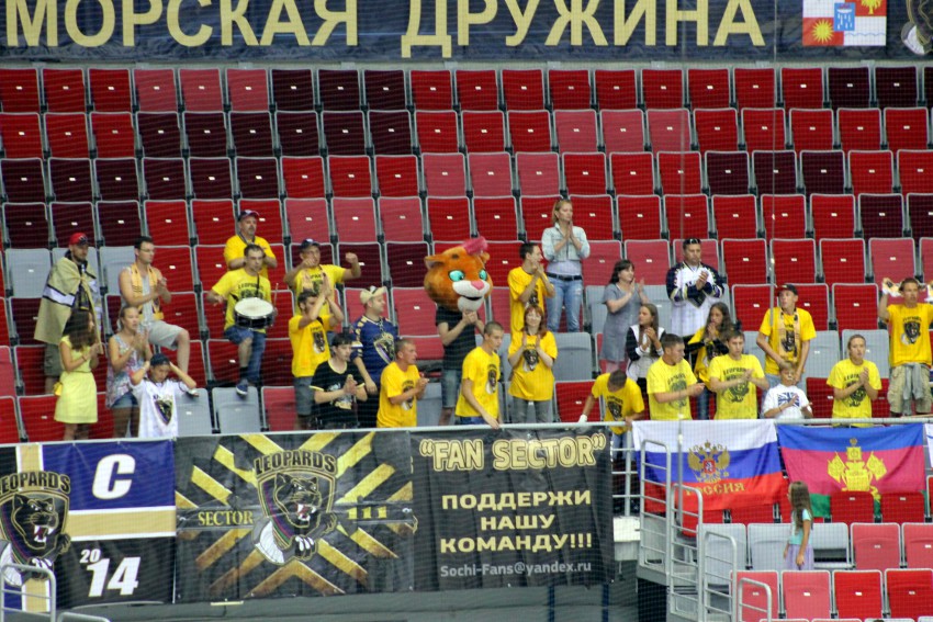 Даже без рекламы игра собрала 4364 болельщика, которые в унисон с фанклубом поддерживали «леопардов» скандированием. Соскучившиеся по хоккею сочинские зрители совсем не смутились пропущенной шайбе на первой минуте и даже проигрышному счёту 0:3 к концу периода.Тем не менее игра шла на равных, сочинцам не хватало скорости.