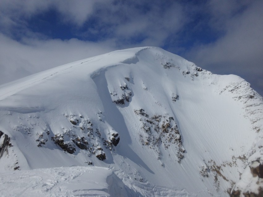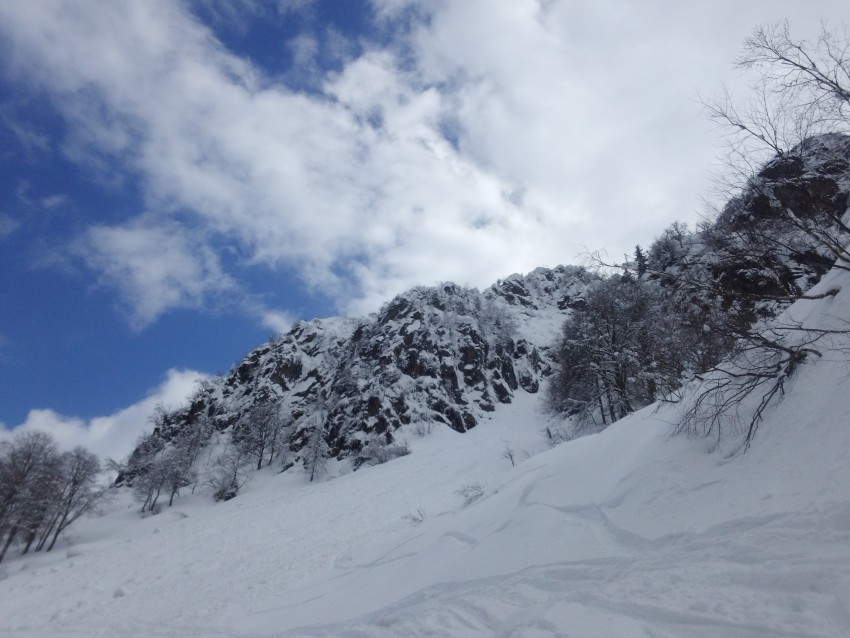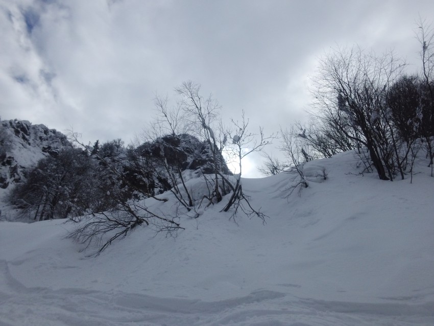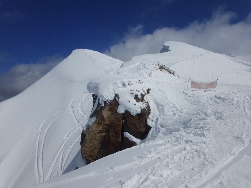 Прекрасная погода и отличный снег, драйвовое и опьянительное настроение не должны отключать сигнализацию «Terrain ahead !». Другими словами, если не знаешь ландшафта, конфигурации кулуара и состояния склона (камень, лед), ну не надо же ехать так, как будто трэк рисуется и формируется исключительно вами в вашем воспаленном и наполненном счастья и адреналина мозгу. При мне паренек за малым не «убрался» со скалы на Юрьевом Хуторе. Думая, что прям с «Фиалки» (название трассы), свернув на хребет он приедет «куда надо». Вовремя я ему заорал. Вот тот самый «камушек», на который выкатил «бессмертный» бордист.