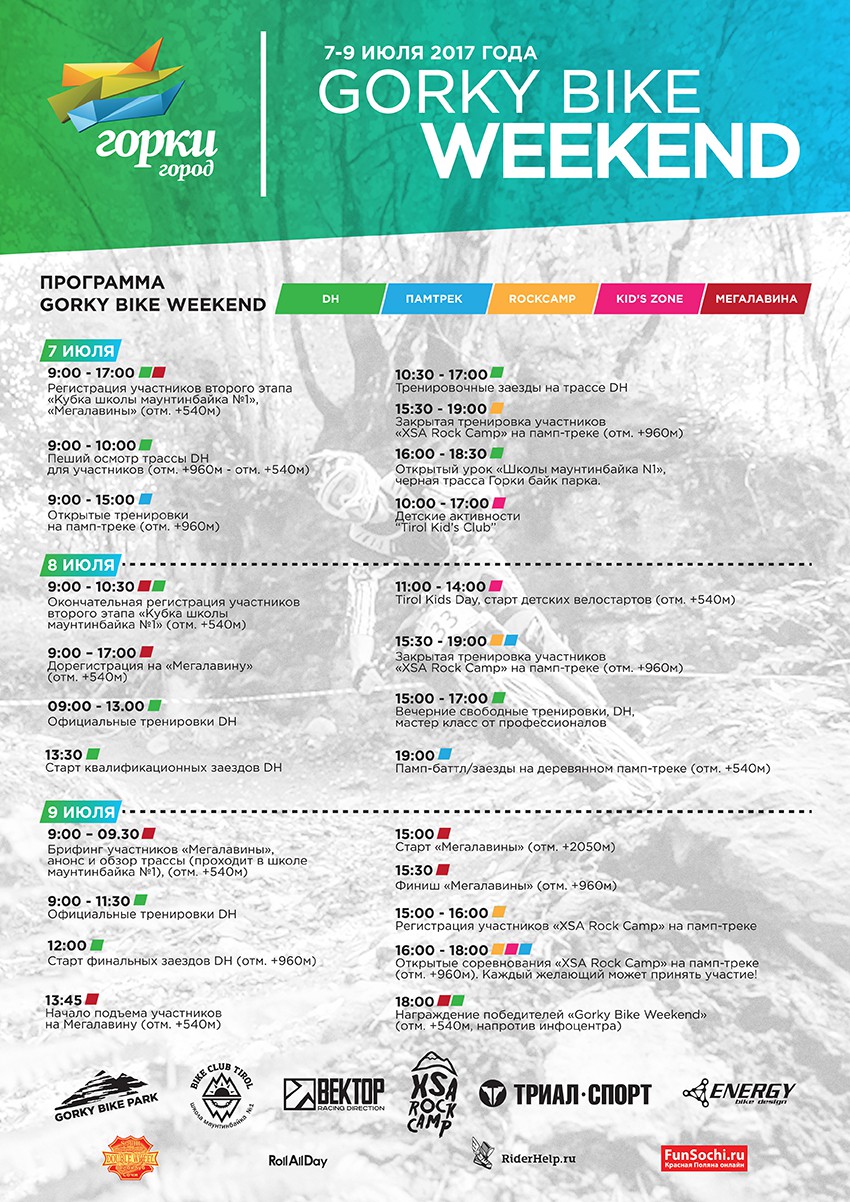 Пройти регистрацию на мероприятиях Gorky Bike Weekend можно будет в помещении Школы маунтинбайка №1 (около «Rider Bar», около станции +540). Регистрация и продажи байк-пассов по специальным тарифам начнутся 7 июля 2017 г.