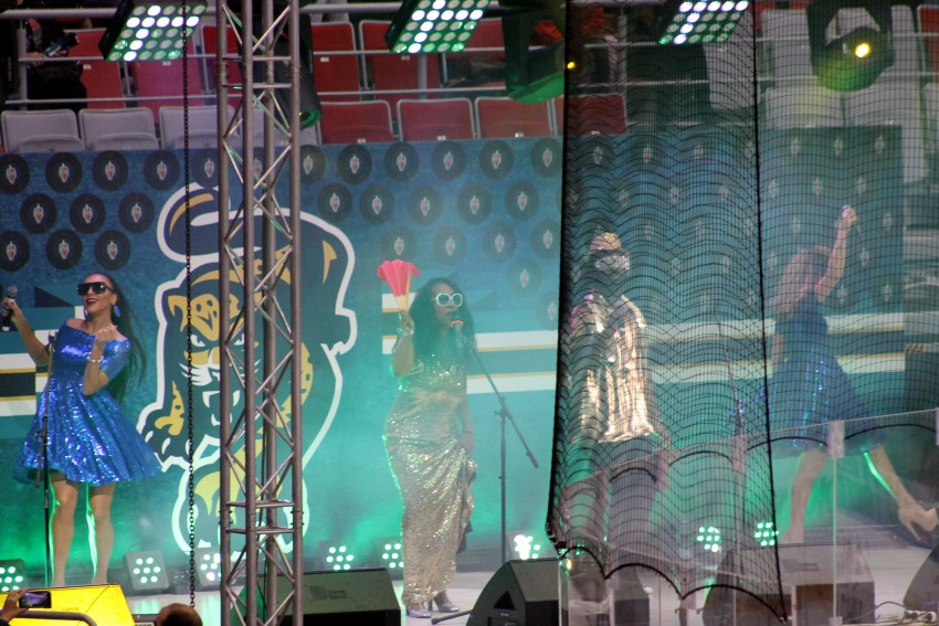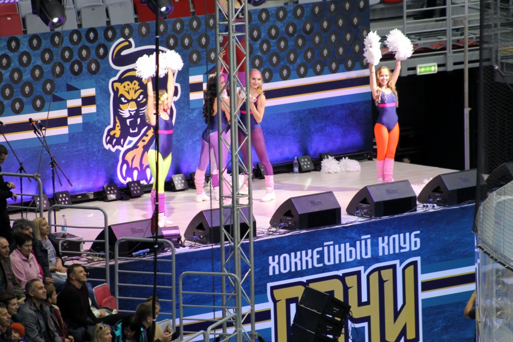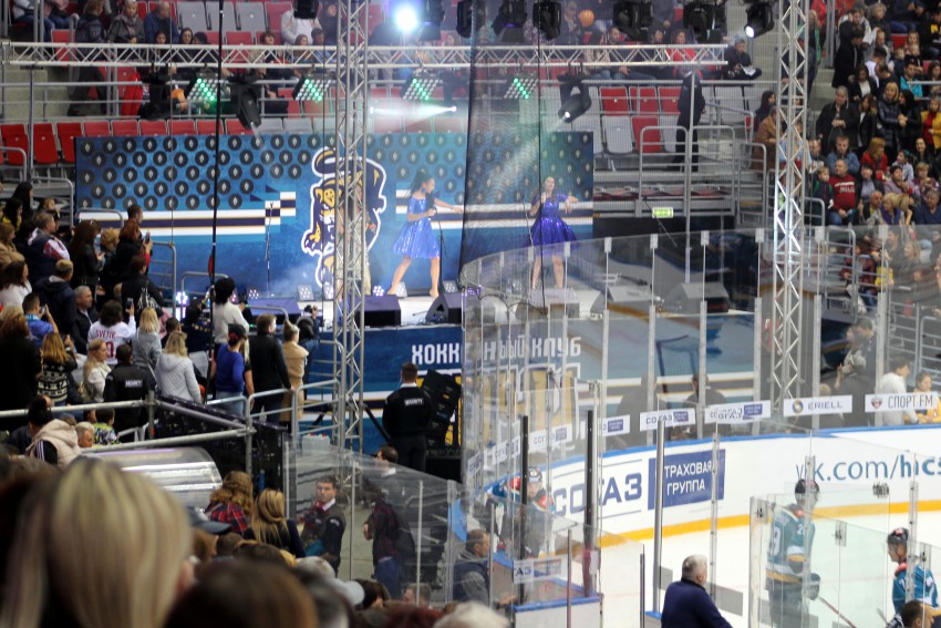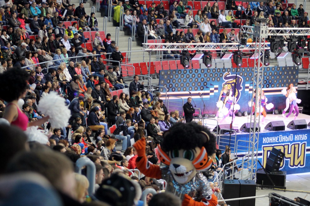 В перерыве танцующие девушки развлекали фигурами. Ведущий комментатор развлекал болельщиков игрой в „кит кат“. Организаторы матча отстреливали майки с логотипом ХК»Сочи" на трибуны.
