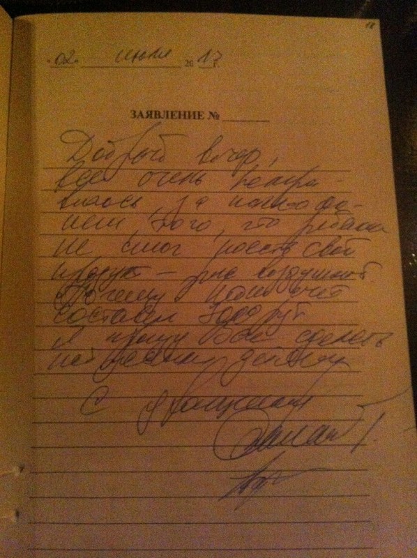 Постарался автор) Всю книгу жалоб сфотографировал) Жаль, что пишет в неё, как правило, пьянь) Автор, а ваша, я так понимаю, последняя жалоба?) Ответьте на вопрос: вы оплатили счёт? Или всю колбасу съели, кроме той, в которой был волос, и платить не стали?))