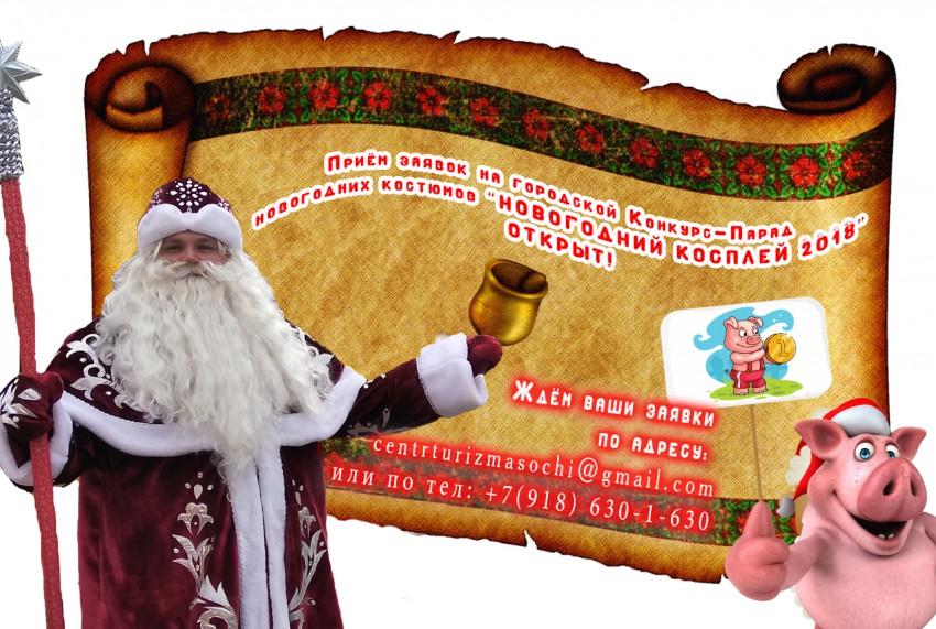 Декабрь насыщен различными пред Новогодними мероприятиями. Один из главных праздников для детей и их родителей будет Городской Парад Новогодних Костюмов «Новогодний Косплей 2018». Приглашаем всех желающих к участию. Парад будет проведён в два этапа. 1 этап — отборочный тур, который пройдёт 17- 21 декабря в Центре туризма Сочи На данном этапе жюри оценит костюмы и то как конкурсанты вживаются в роль своих персонажей, отработают с ними Новогоднее дефиле, после чего лучшие получат приглашение на 2 этап, сам парад 23 декабря, где участники продемонстрируют своих персонажей на свежем воздухе.