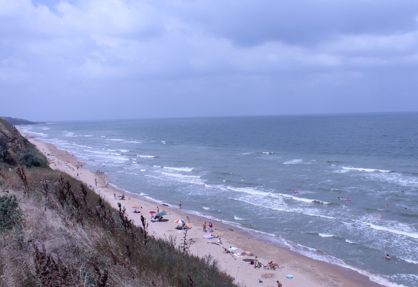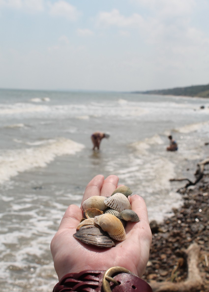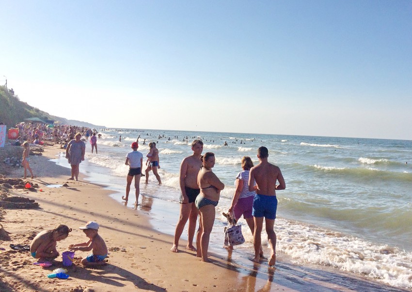 Вернувшись, мы пошли на центральный пляж посёлка купаться. Спустились по ступенькам к морю к переполненному людьми пляжу. Море было тёплым, ласковым, с небольшими волнами, на которых плескались счастливые дети и взрослые. Берег моря песочно-ракушечный, и его мелководье тянется на несколько десятков метров.