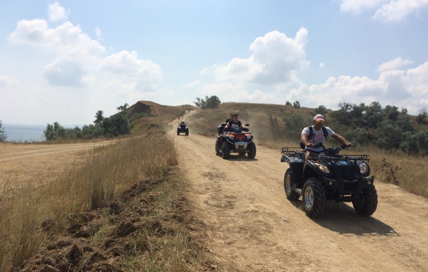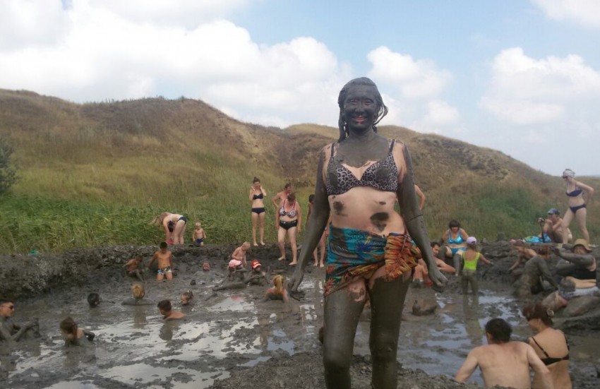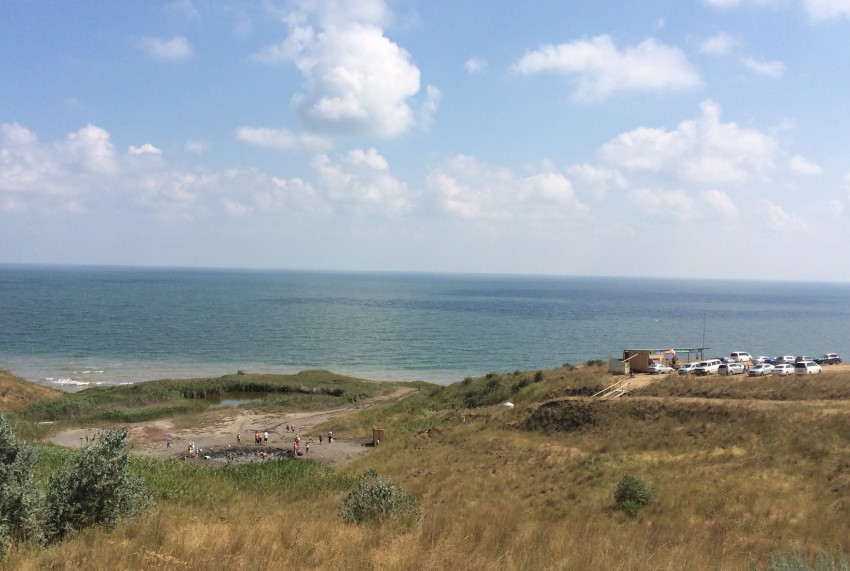 С утра мы переехали на мыс Пекла. Дорога проходила через персиковые сады и виноградники, бахчи, ореховые аллеи и привела нас на крутой берег Азовского моря. Здесь мы посетили ещё один грязевой вулкан — вулкан Пекла. У него ещё нет хозяина, и поэтому посещение его пока бесплатное. Здесь грязь отличается от предыдущего вулкана по цвету, запаху, консистенции.