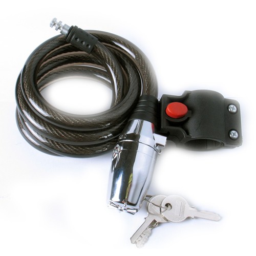 Вариант 2. Замок с сигнализацией, стоит дороже, срабатывание настраивается по датчику удара (трогают велосипед, пытаются нести), и по перерезанию троса. Срабатывает сирена (100db), в более дорогих моделях пищит брелок. Из минусов, нужно находиться не далеко от велосипеда, что бы услышать.
