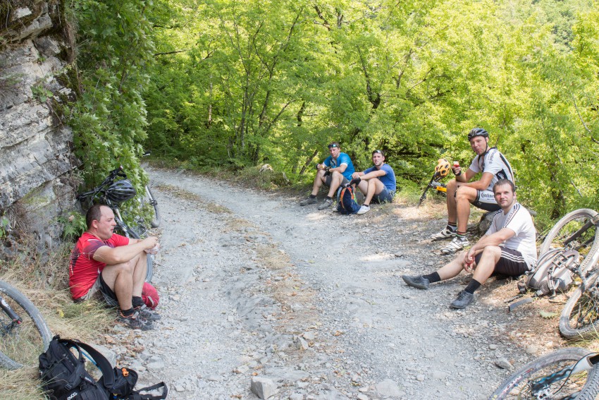 Хоть и ехали большей частью в тени и вроде как в прохладе, но духота сказывалась, сил потеряли очень много и устали. Доехали до посёлка, прикинули, что вниз к Безымянному водопаду не успеем, поскольку планировалось вернуться засветло. Делаем небольшой привал, перекус и собираемся в обратный путь.