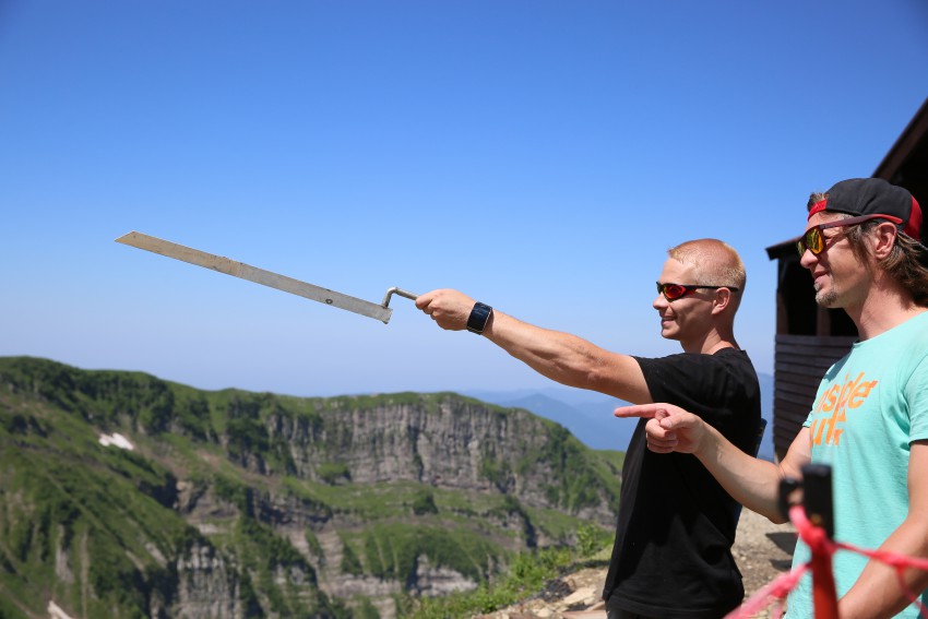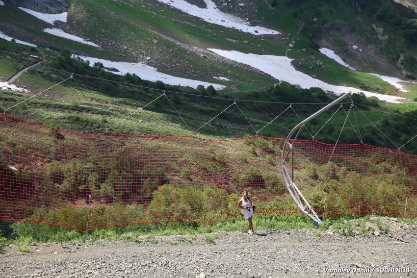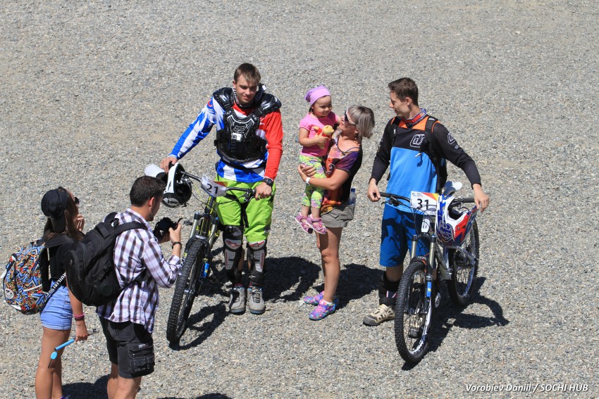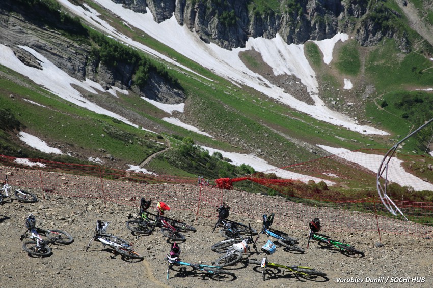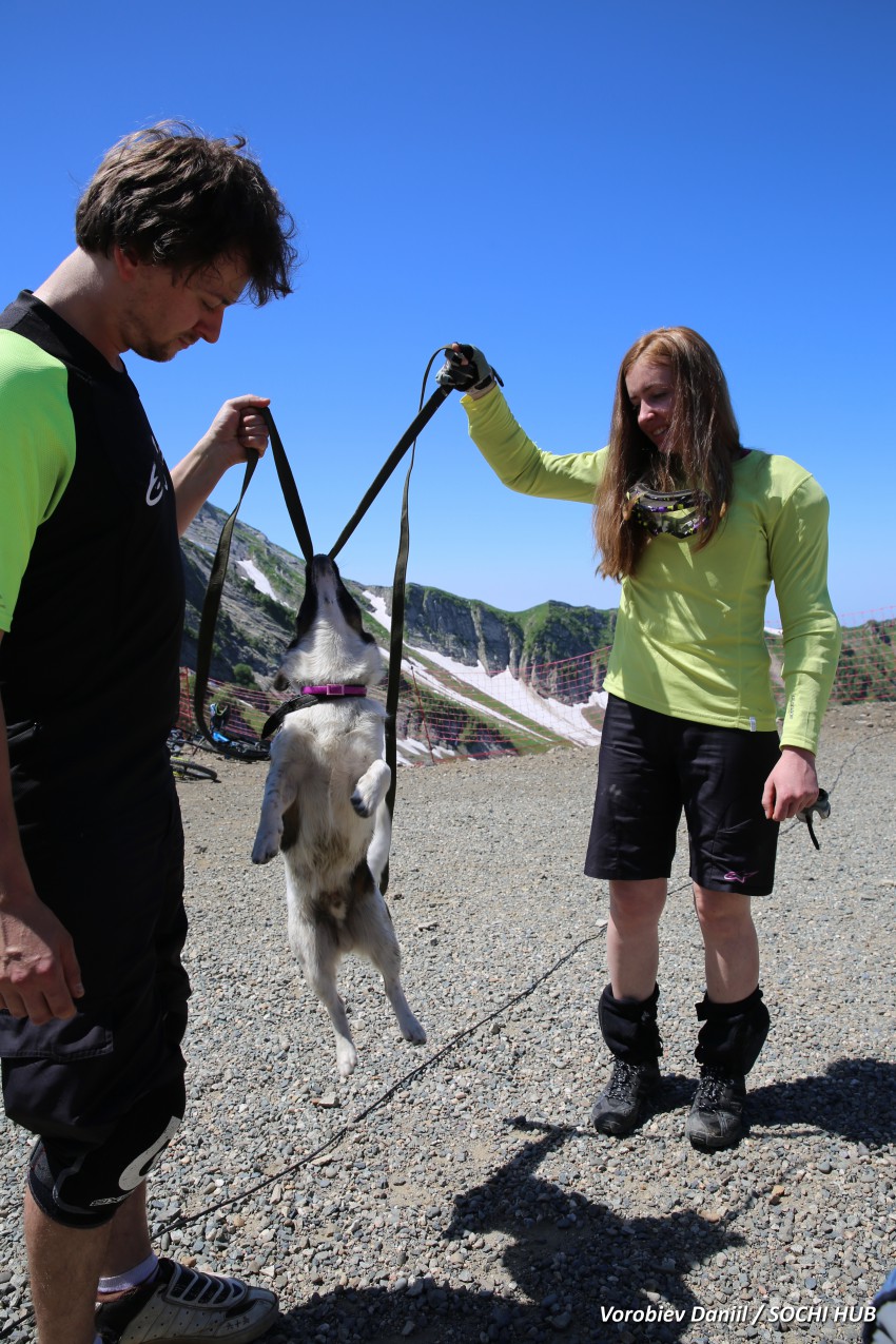 Соревнования проходили в дружественной атмосфере, пока мы поднимались в гондоле на верх, участвующие в заезде ребята рассказали мне много интересного, в том числе как лучше фотографировать начало «мегалавины» и ее продолжение уже с канатки, на пути вниз к финишу. Участвовал даже пёс по кличке Санта Круз, и сумел обогнать некоторых райдеров, а наиболее стойкие, но пробившие колёса — финишировали бегом с байком, в верхней же части трассы еще многовато снега и это не сюрприз, но испытание. В этот солнечный выходной день не было столпотворения народа, на курорте всем хватило места: и экскурсантам ехавшим на канатке в «2й цирк» под вершину Чёрная Пирамида, и байкерам мчащим по горнолыжной трассе, и сернам мирно пасущимся в «1м цирке»… всё супер — только солнце не за нас )) используйте все способы защиты — у фотографа передоз солнечного заряда…