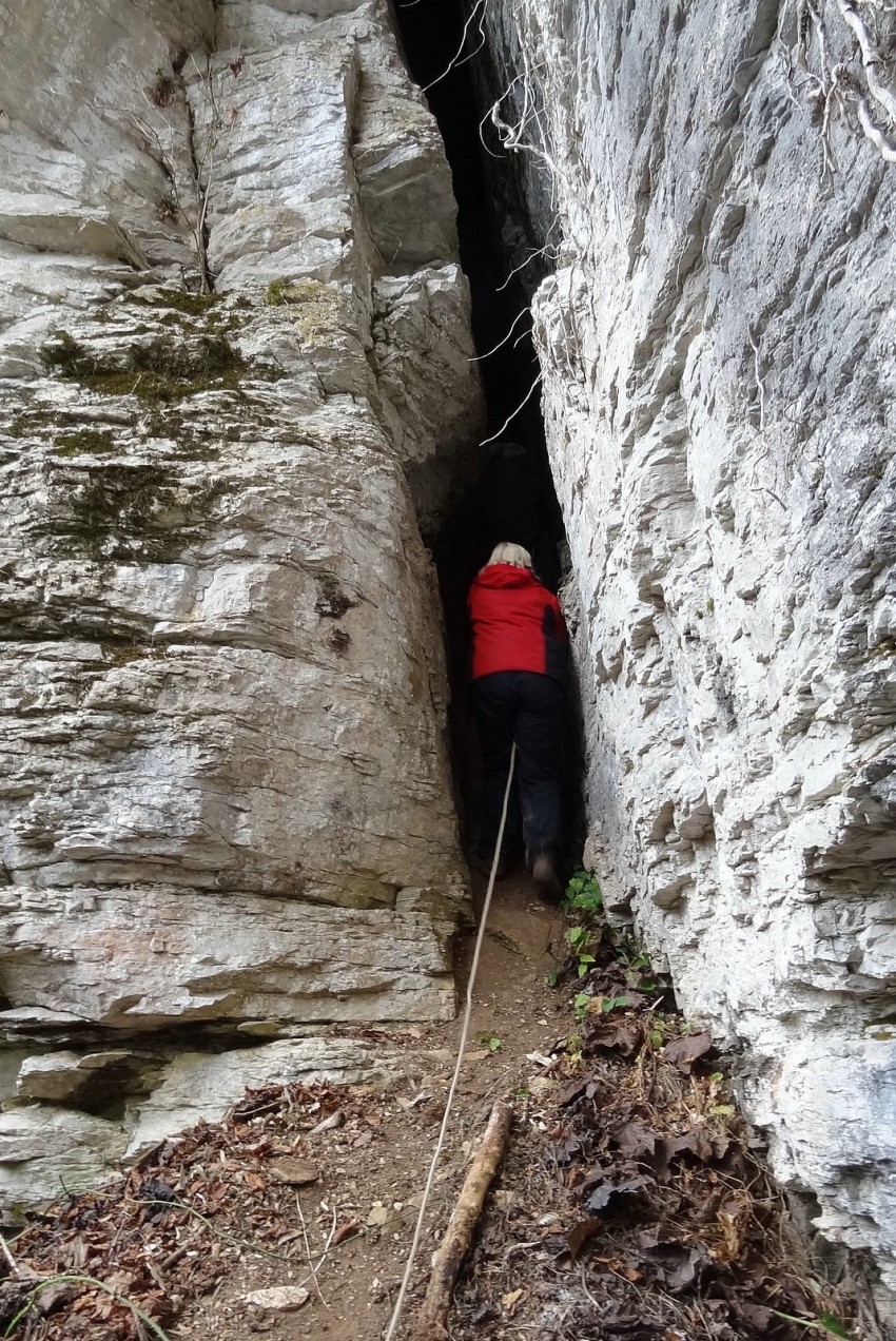 Вход в пещеру – узкий разлом в скале, очень крутой, чтобы пройти Новиков натянул веревку. Высота входа 235 м