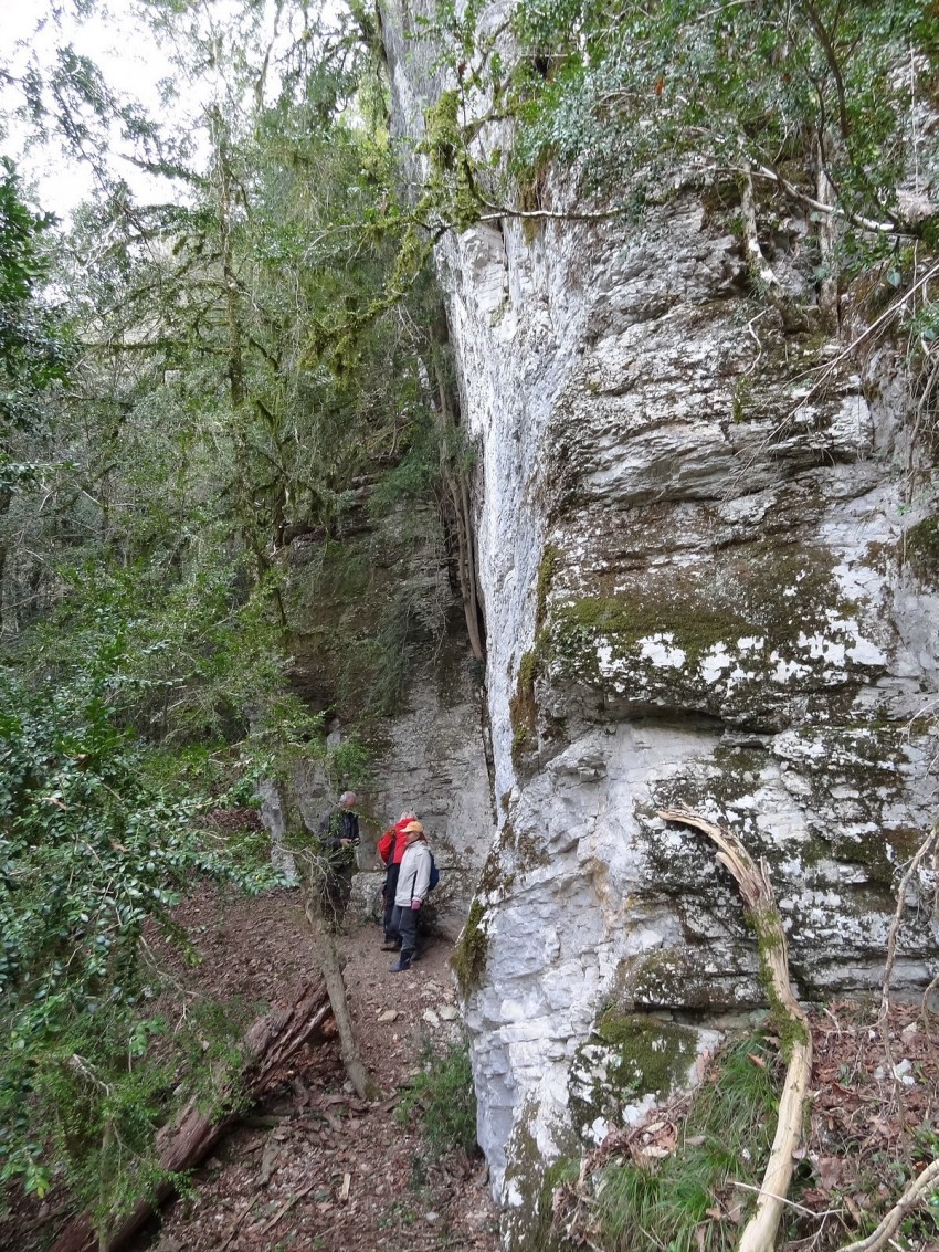 Спуск к пещере идет через отвесные скальные полки каньона.
