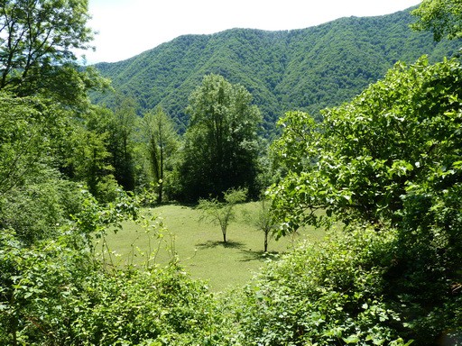 Внимательно рассматриваем его и решаем переходить без страховки. По тропинке поднимаемся наверх, там где должны быть останки летовок. Так показано на картах. На самом деле, даже следов мы не обнаружили. Заночевали на полянке среди густых зарослей фундука, подложив под спальники толстый слой папоротника.