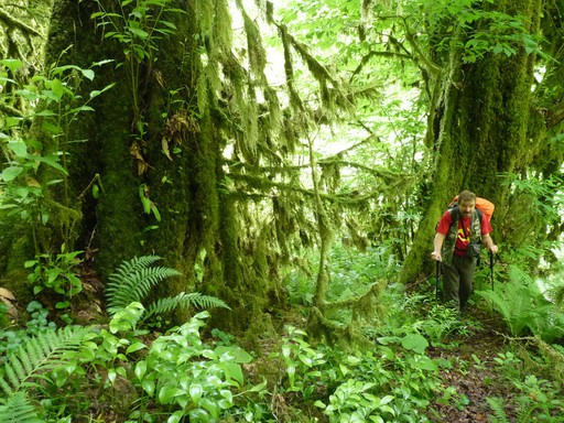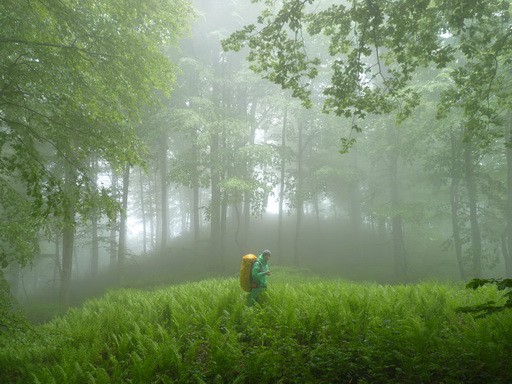 25 дней назад я был на этом самом месте. Небольшой слой снега и полянки с крохотными цветочками. Трава и кусты прижаты к земле. Сейчас эти места не узнать совершенно. Черника высотой в рост человека, вот вот зацветёт. Рододендрон, недавно отцветший, в полтора человеческих роста и самое страшное — лавровишня в два и три метра высотой. Всё это и по отдельности и вместе перемешано на гребне хребта. Скорость передвижения просто смешная. Только на полянках с папоротником и отдыхаешь. Слава богу, погода улучшилась и выглянуло солнышко.