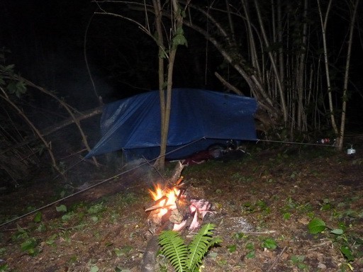 Палатку с собой не брали из-за экономии веса. Ночью сверкала молния и лил дождь. Нас спасал тент от дождя и толстый слой листвы на деревьях. Рядом тихонько о чём то бормотал ручей Мельничный.