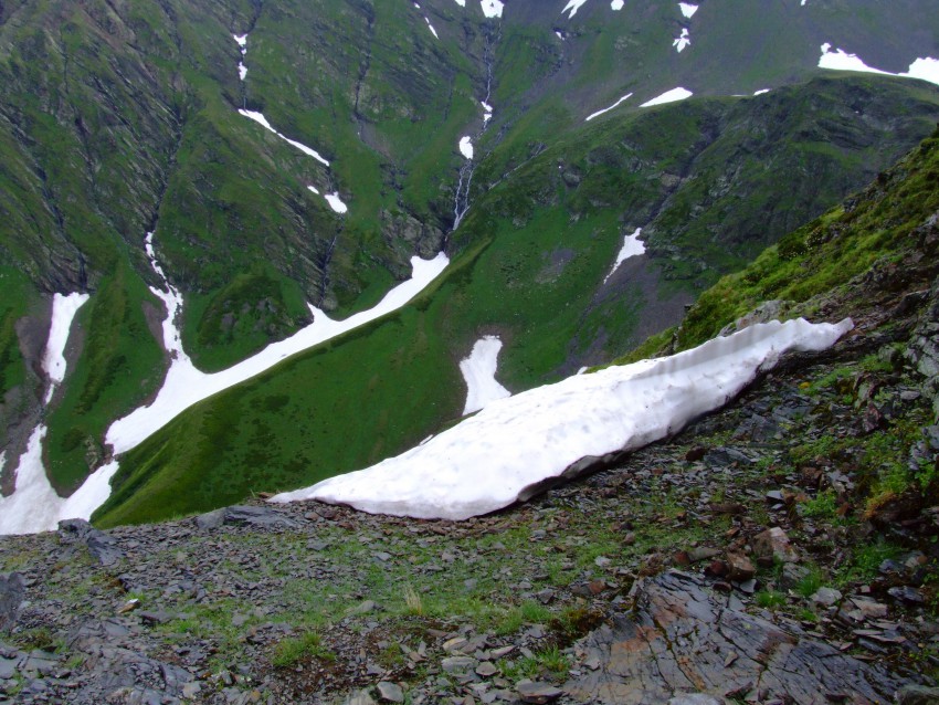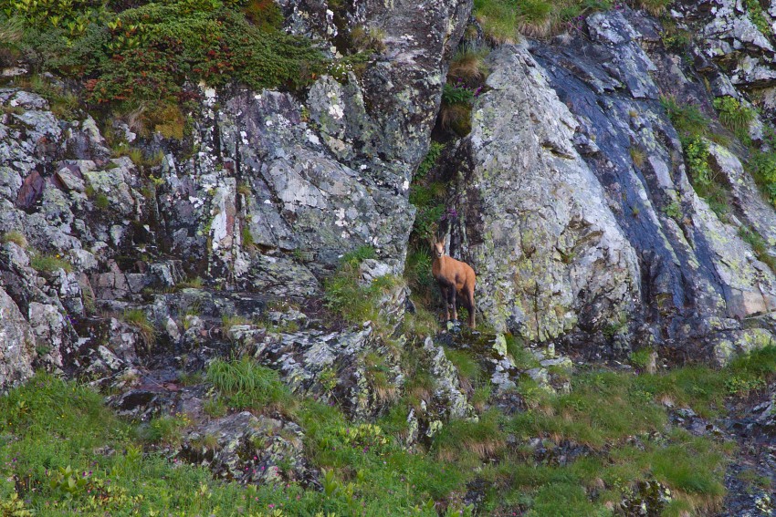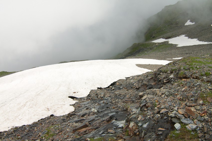 Вскоре появляются снежники и где то в тумане проносится стадо серн (если я не ошибся).