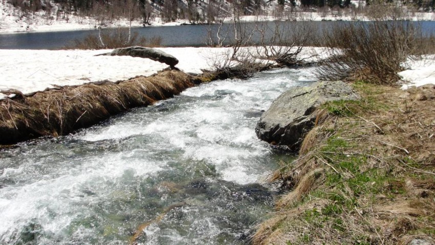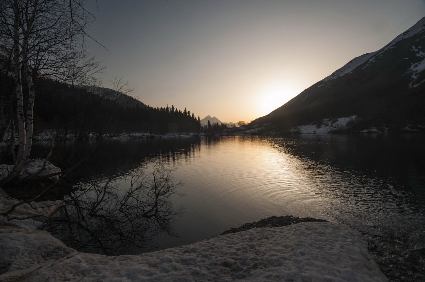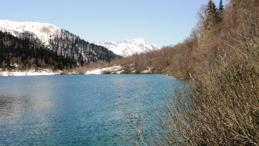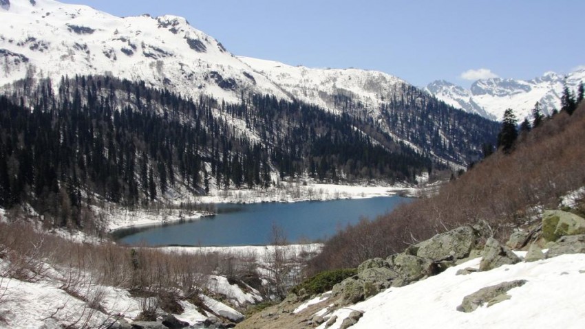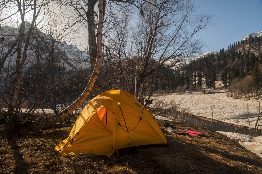Поляны для лагеря свободные от снега были на северном берегу на небольшом удалении от озера. Остальная часть берега озера была в снегу.