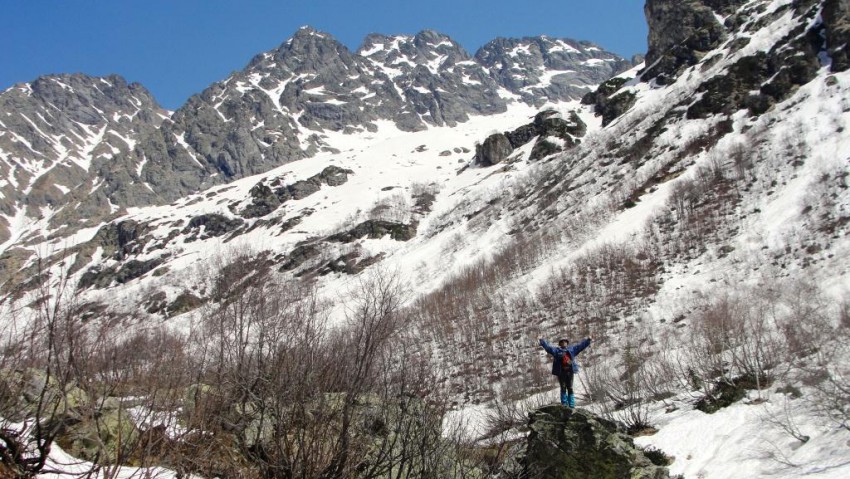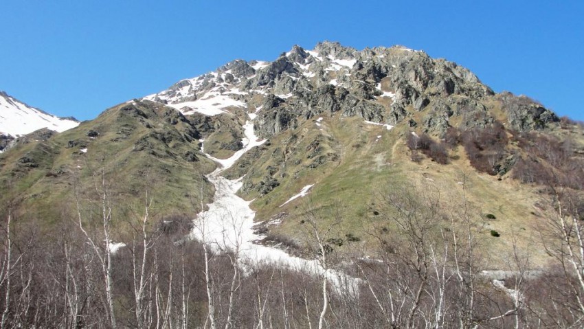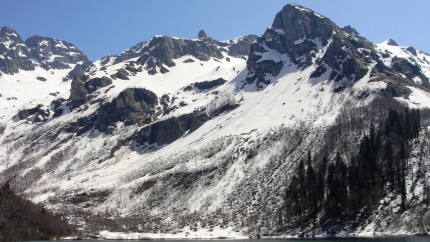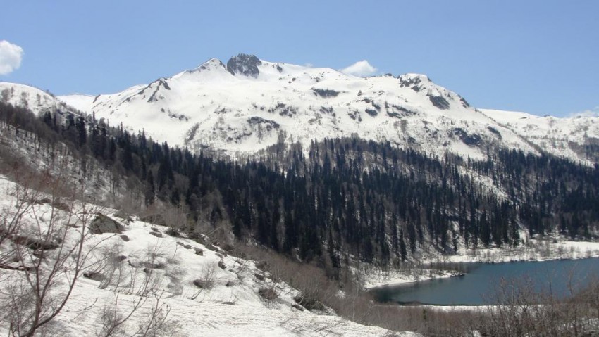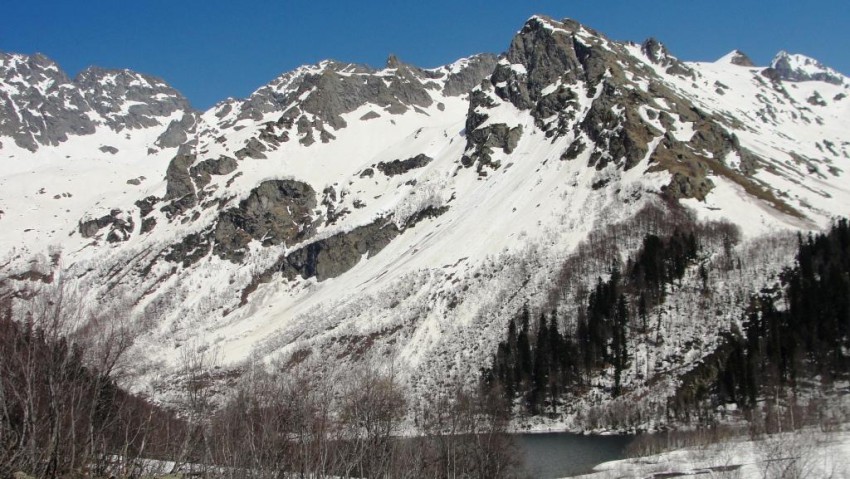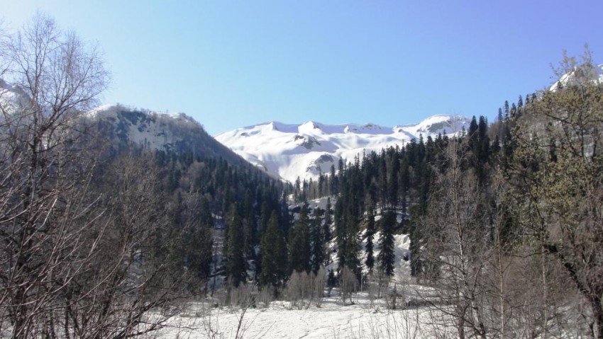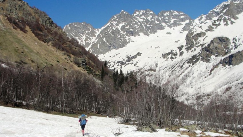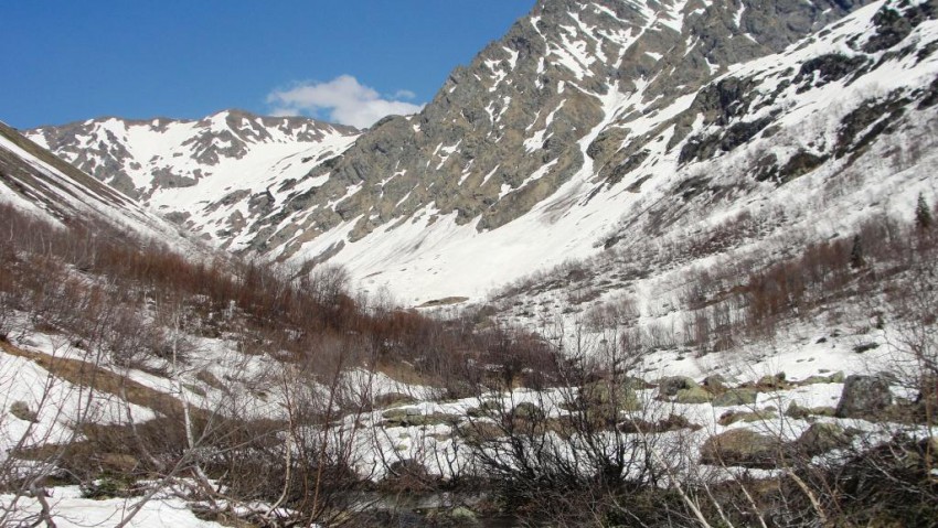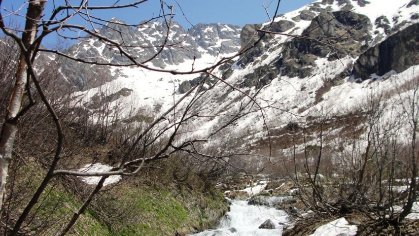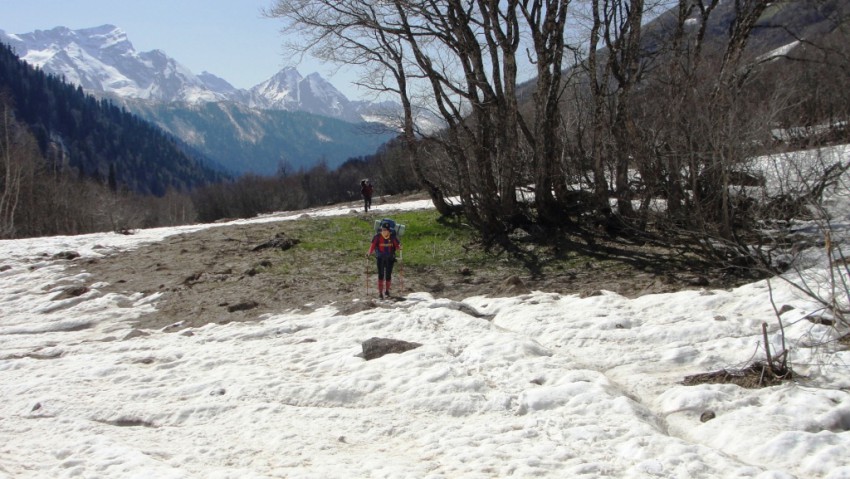 Длинные майские праздники подтолкнули открыть сезон походом на Кардывач. Заповедник разрешил маршрут с 1 мая. Поначалу группа собиралась большая, но с приближением дня выхода нас осталось пятеро. Заказали машину, оформили пропуска в заповедник и в 09-30 1 мая выехали из Красной поляны. О снежной обстановке никто толком сказать не мог. Предполагали, что снежный покров начнется где-то после Азмыча. Егеря на Энгельмановской поляне тоже информацией толком не владели. По дороге встретили еще одну группу из трех ребят. Они ушли вперед и в этот-же день были на Кардываче. А мы решили идти в два перехода. Погода стояла отличная, в итоге снег начался только перед самым озером.