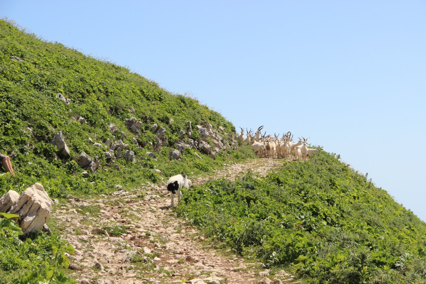Собака подошла к нам, долго нас разглядывала. Поняв, что мы не представляем опасности, пошла дальше. Только тогда за ней двинулись козы. В середине стада шла еще одна собака-пастух, которая также долго стояла около нас: